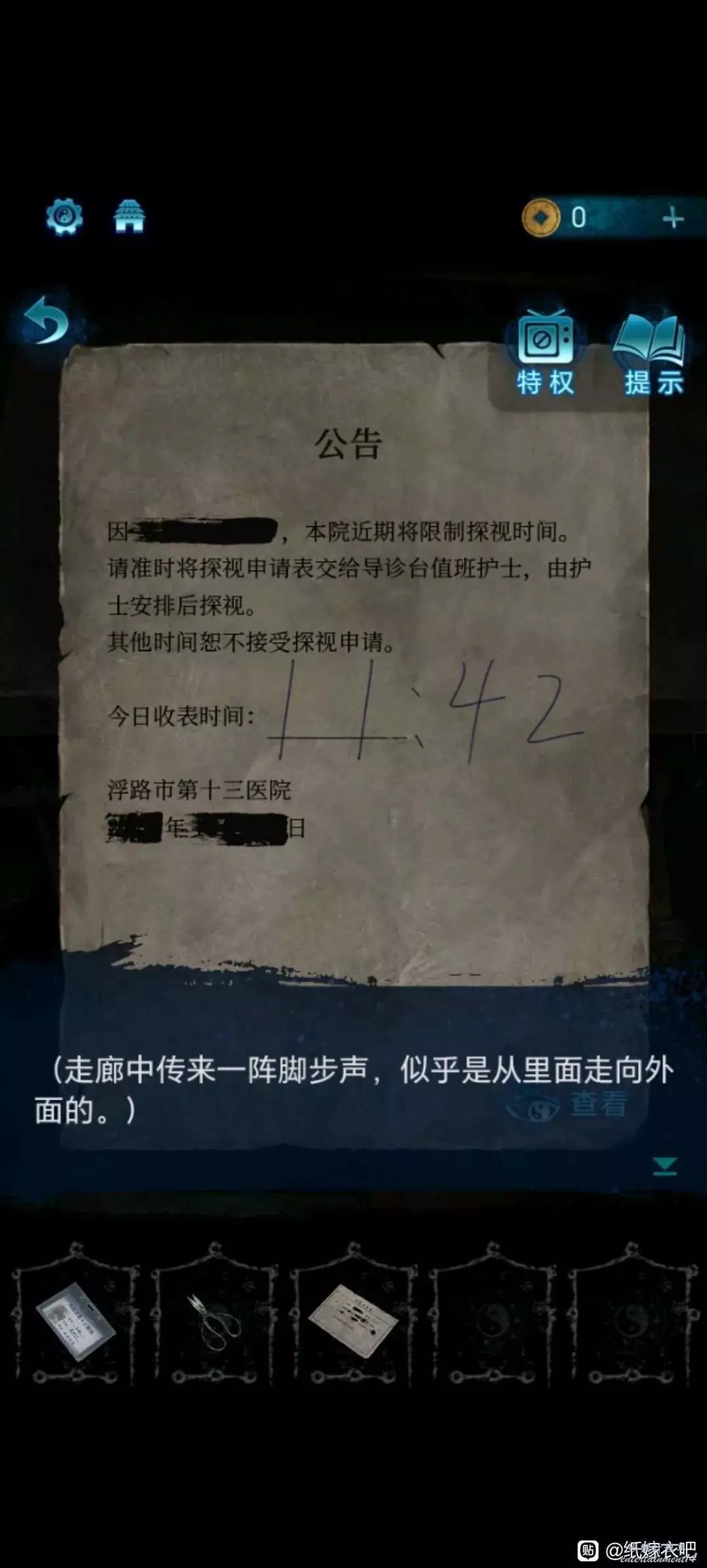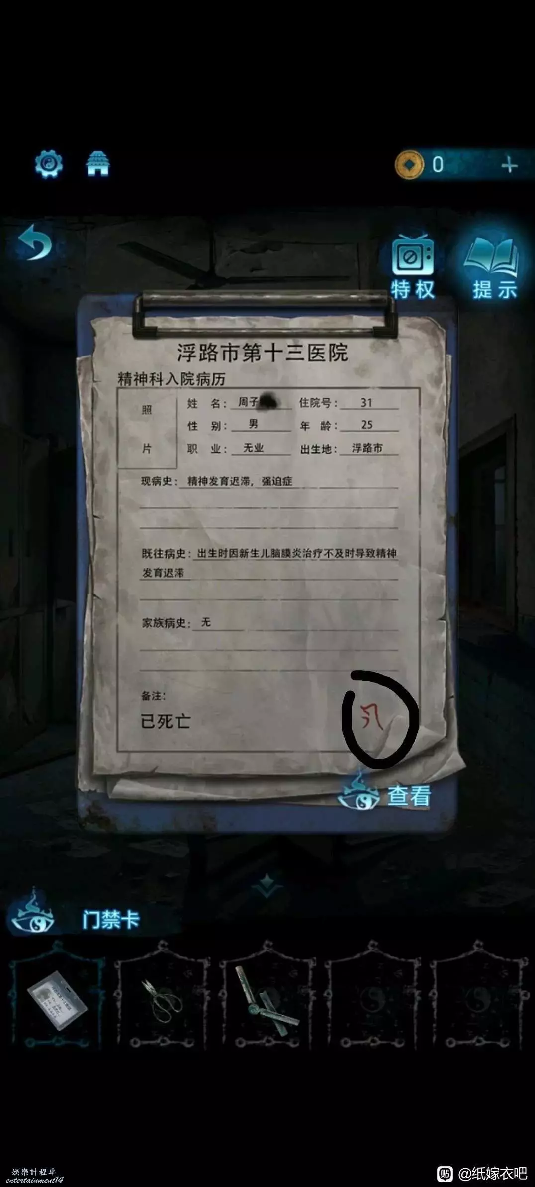 3.根據診斷書左側的箭頭線索,與點擊釘子順序對應,打開窗戶進入肖家 。