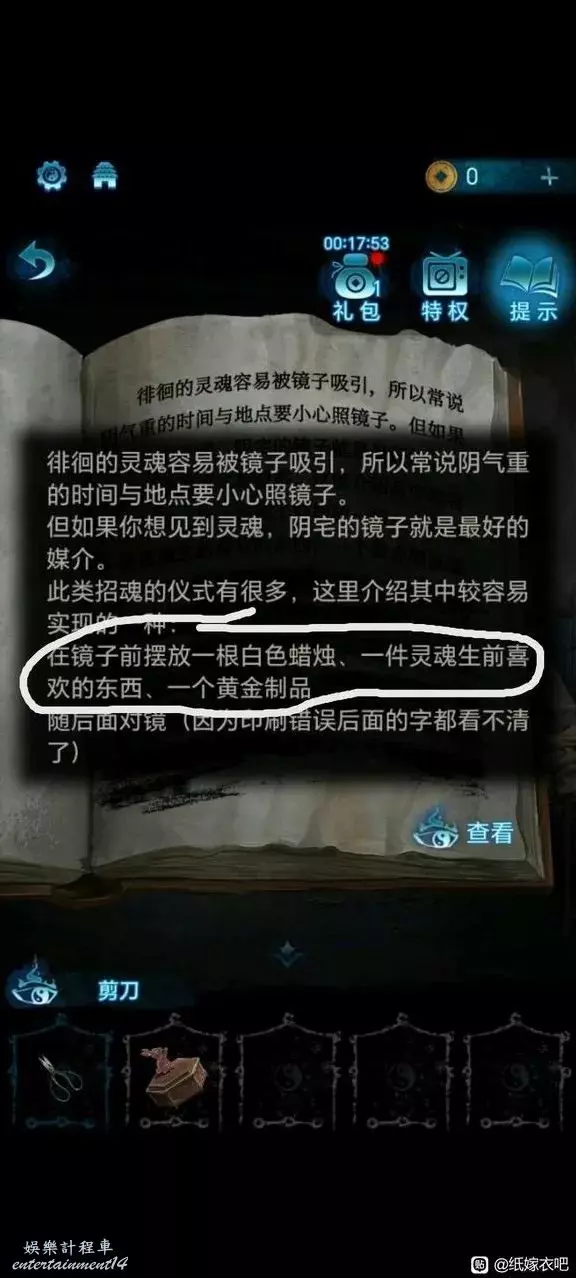 根據床頭櫃上的書的線索 分別將白色蠟燭 靈魂生前喜歡的東西(音樂盒)一個黃金製品(金像)放在鏡子前的白圈內。