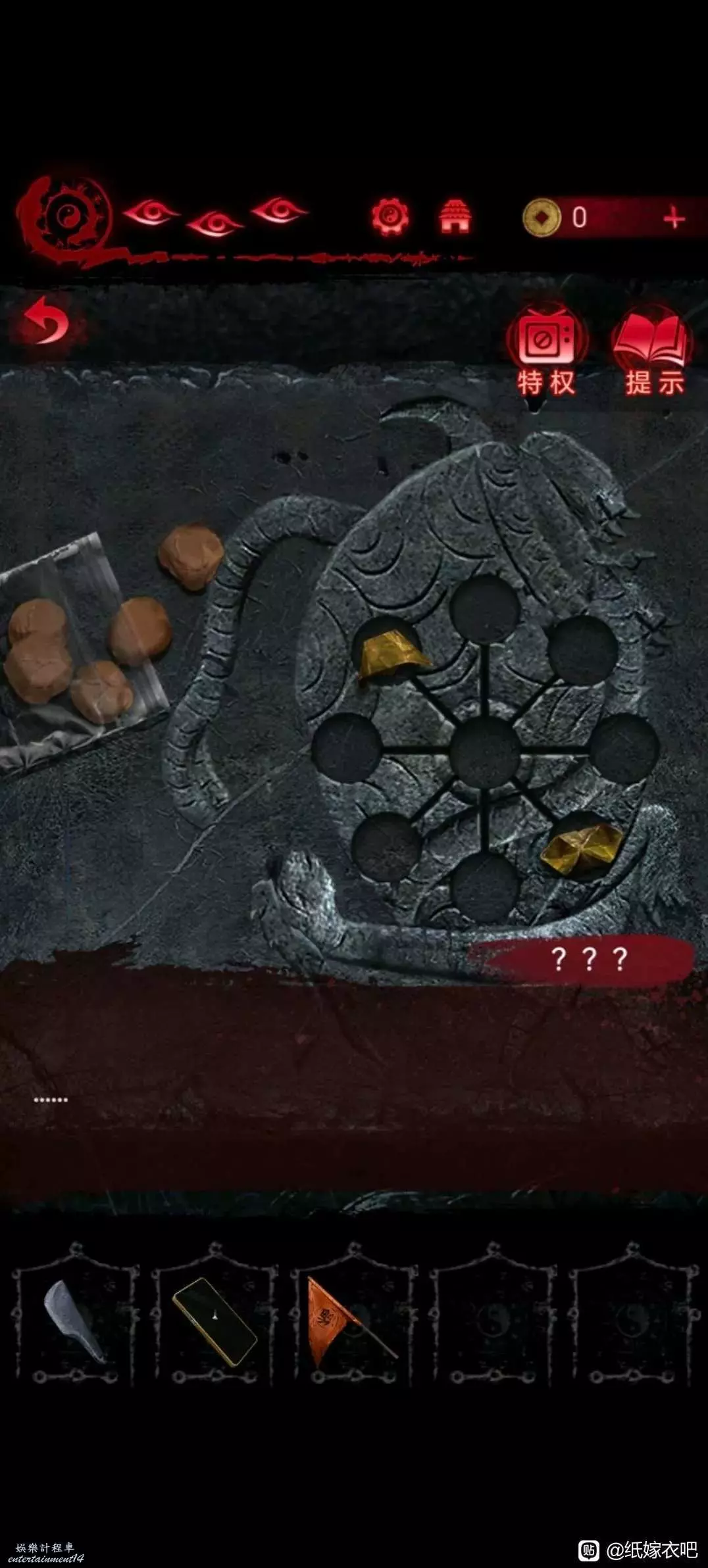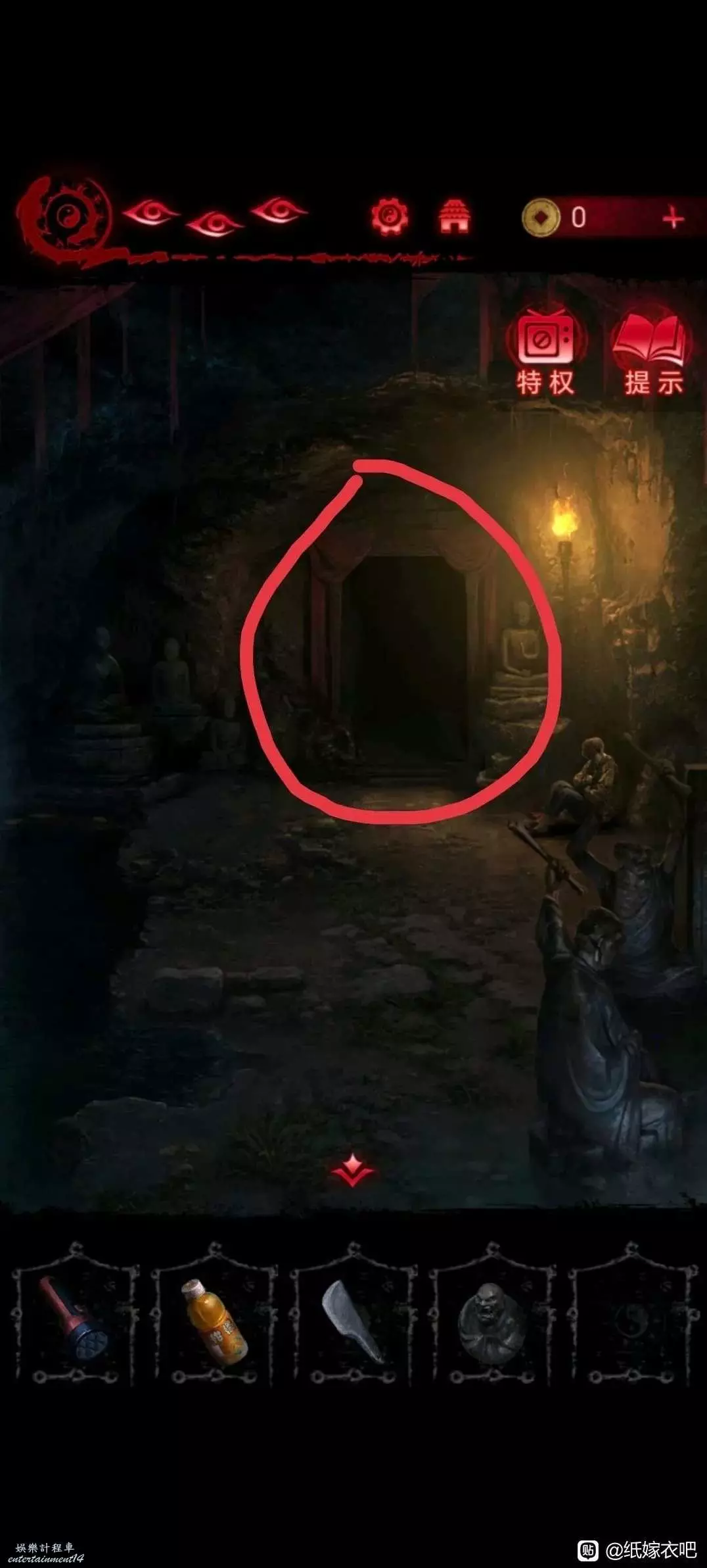 11.隨後進入廟裡 點擊桌子旁邊的棺材,用石刀割開紅繩拿到嗩呐 然後將手機放入桌子旁邊,石碑上的凹槽 點擊嗩呐,再點擊手機方可吹奏
