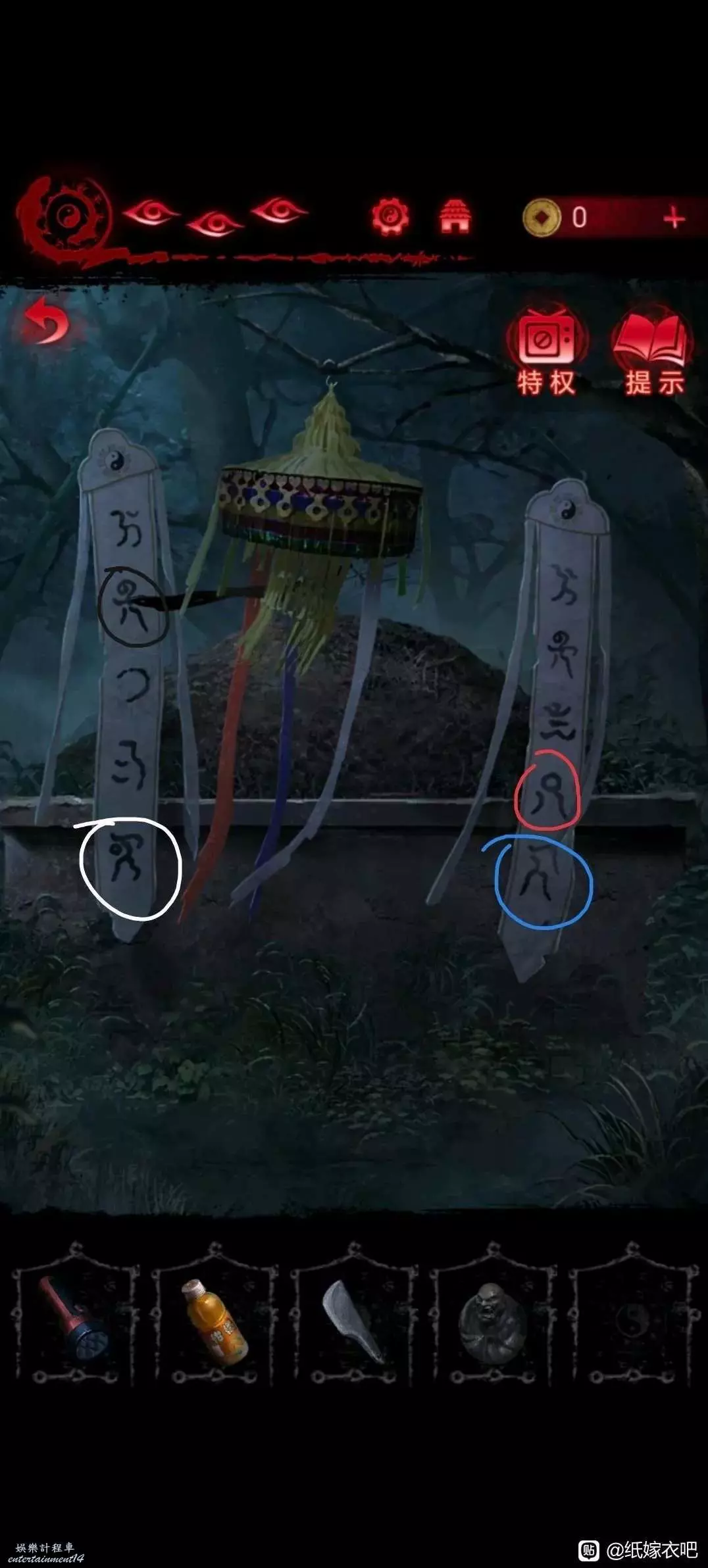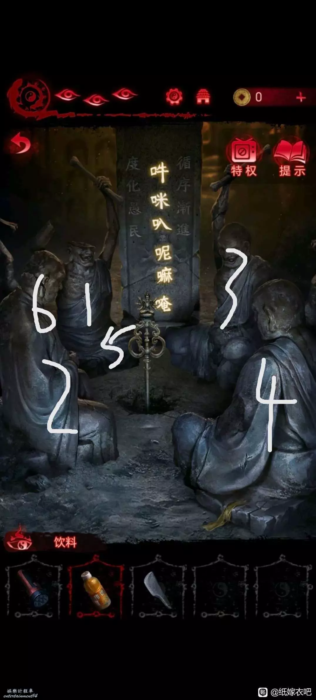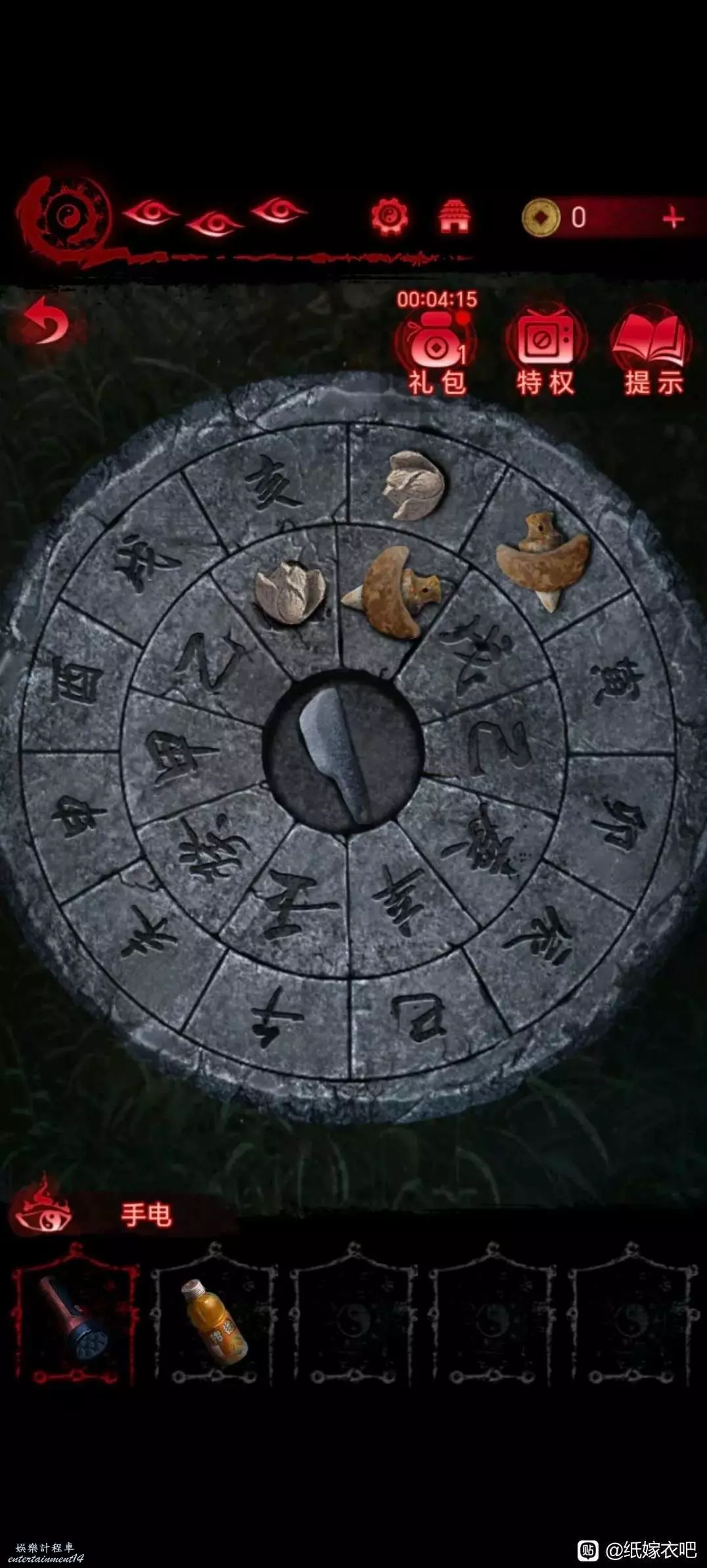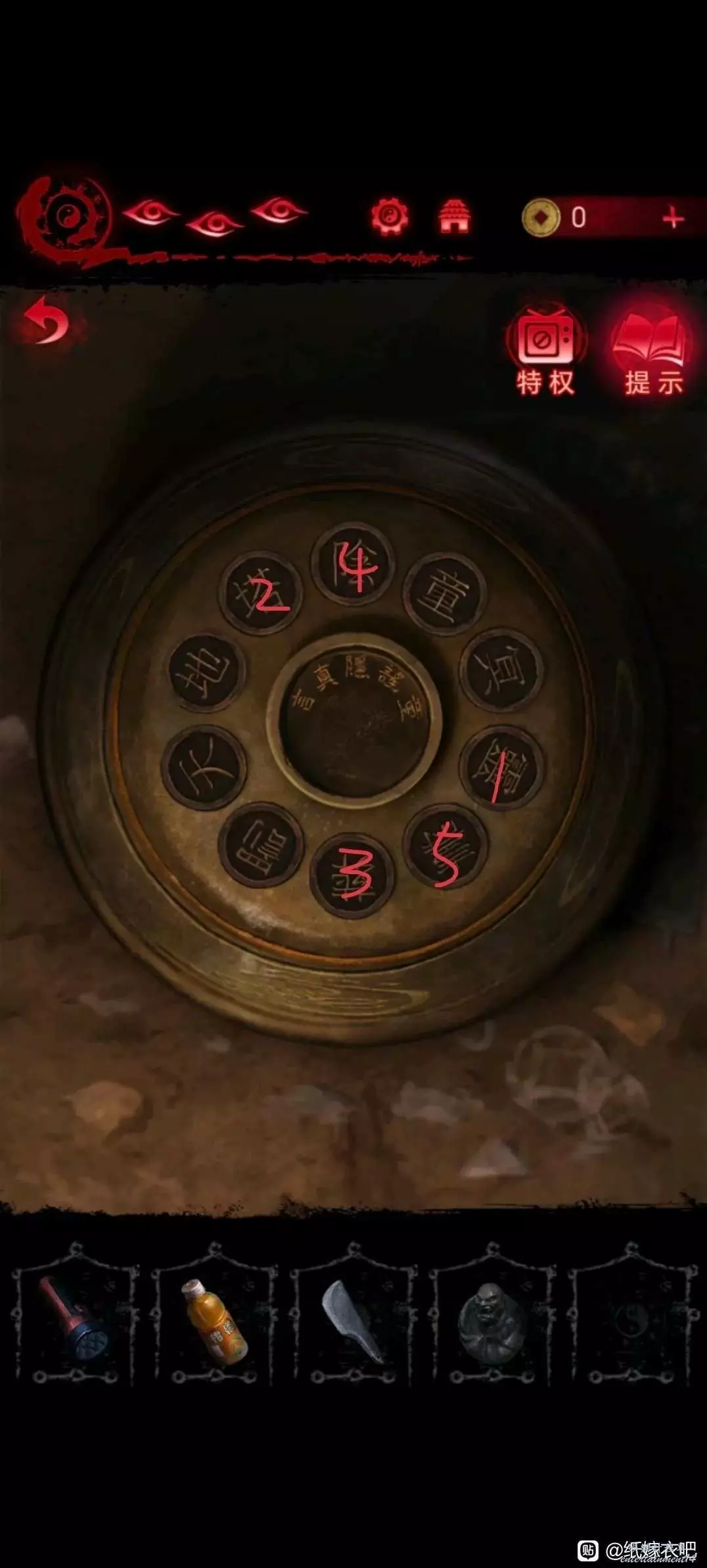 8.根據筒子旁邊木門的指示轉動羅盤(好像是這麼叫)將鬥指後面兩個字在盤上一起轉動到最右側 隨後會亮起藍色字 根據藍色字轉動木門機關打開木門