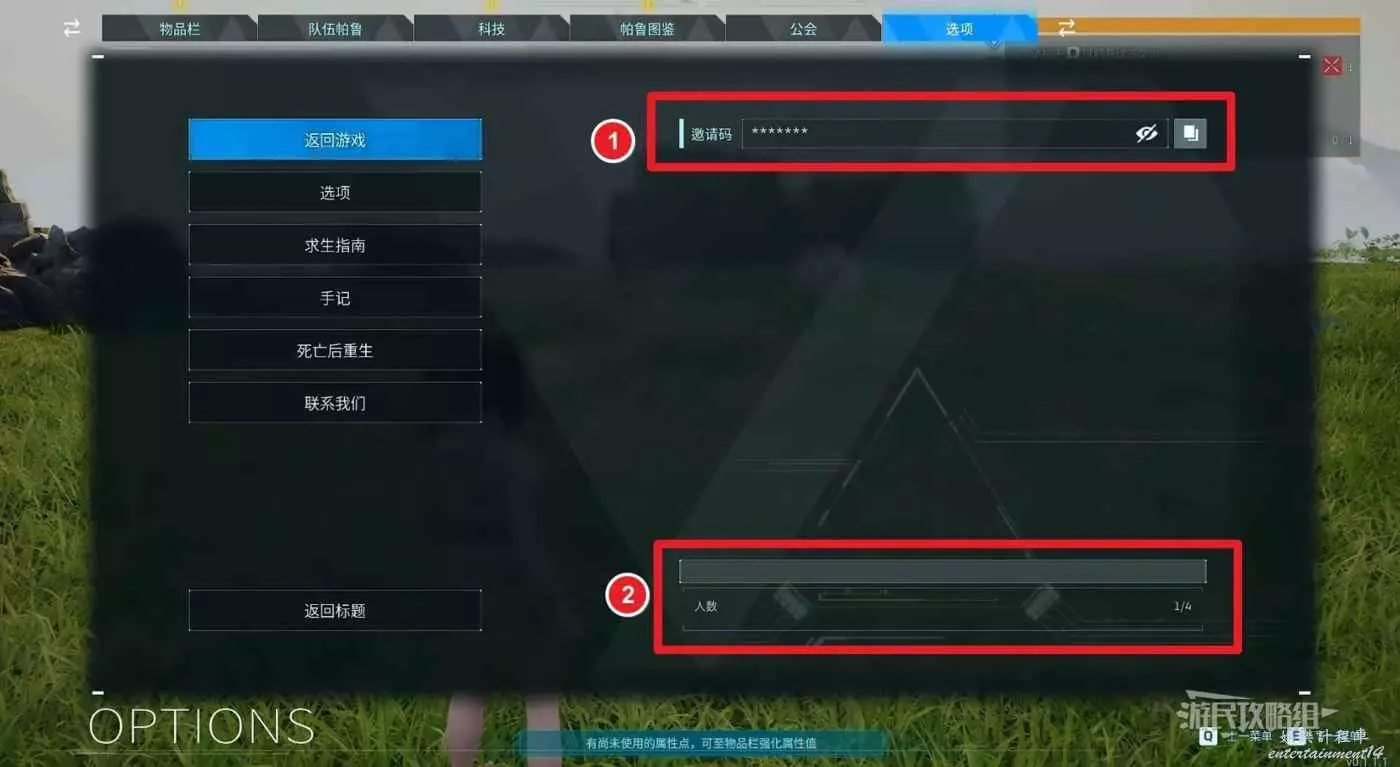 參考下圖,①為邀請碼,點擊眼睛標誌可以顯示/隱藏,兩個方框圖標為複製。②為當前世界,玩家可以查看當前世界和當前世界中的玩家人數。
