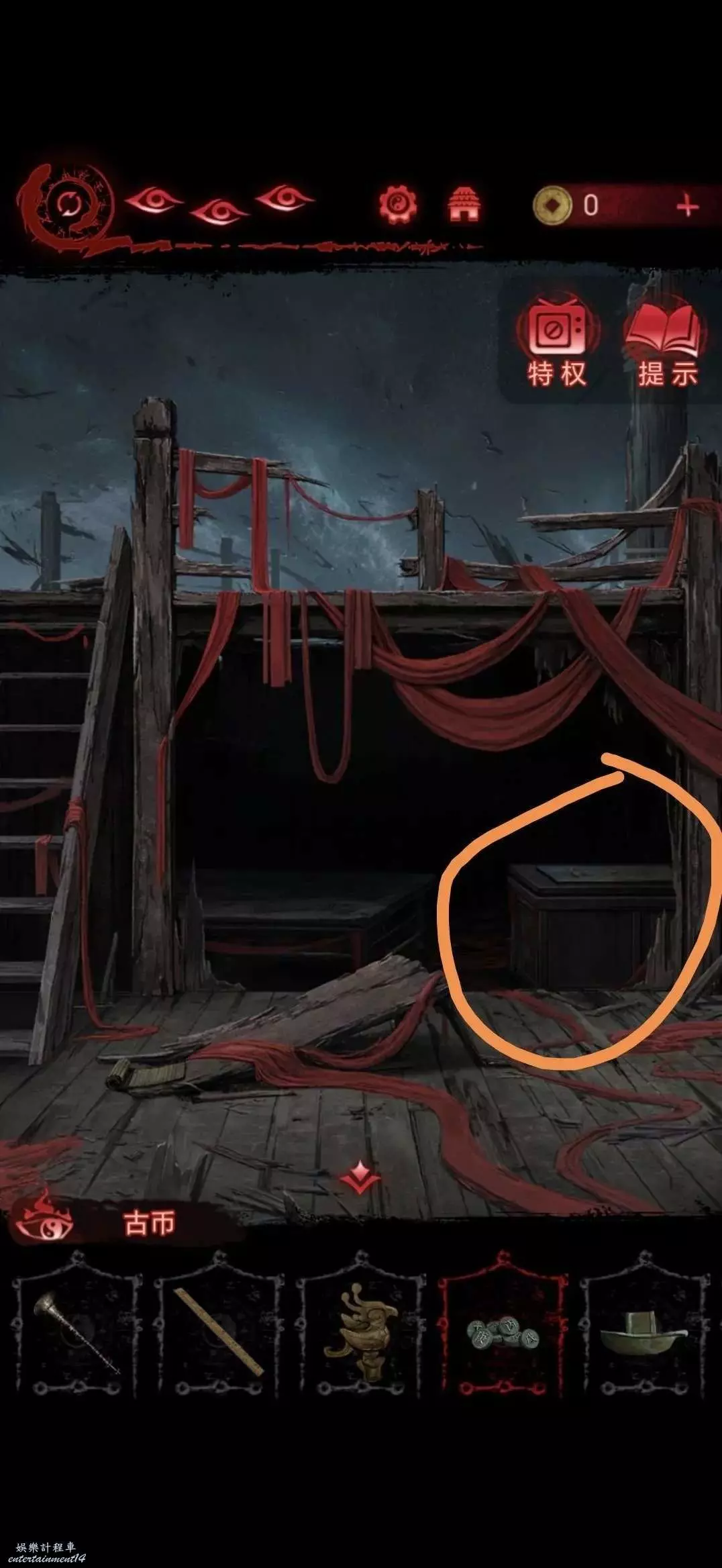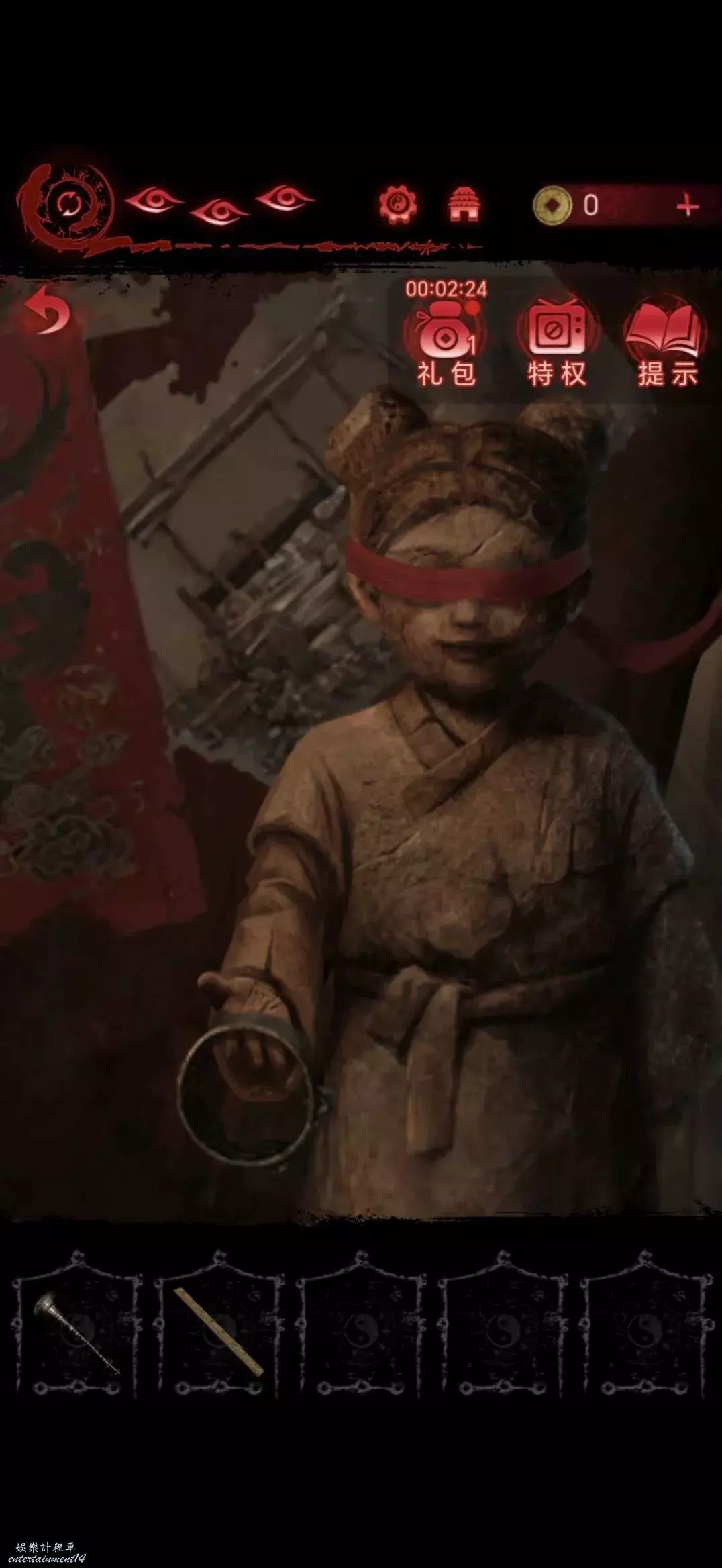 進入廟裡,點擊左邊箱子,做小遊戲,做完獲得布娃娃,木塊和銅鏡