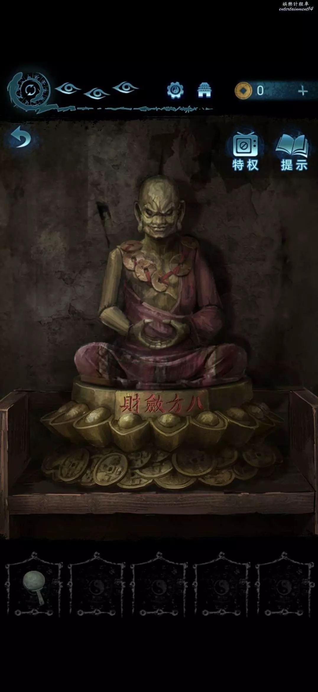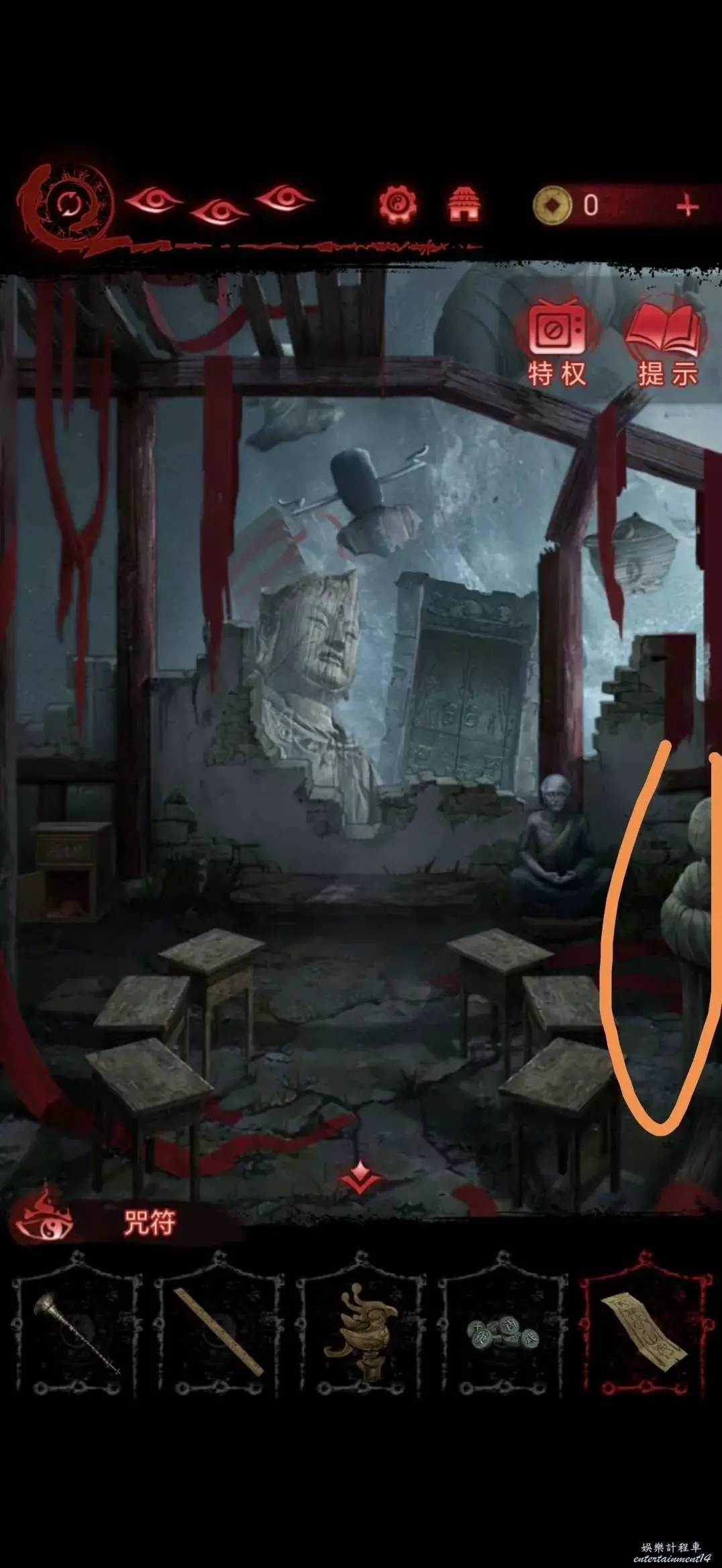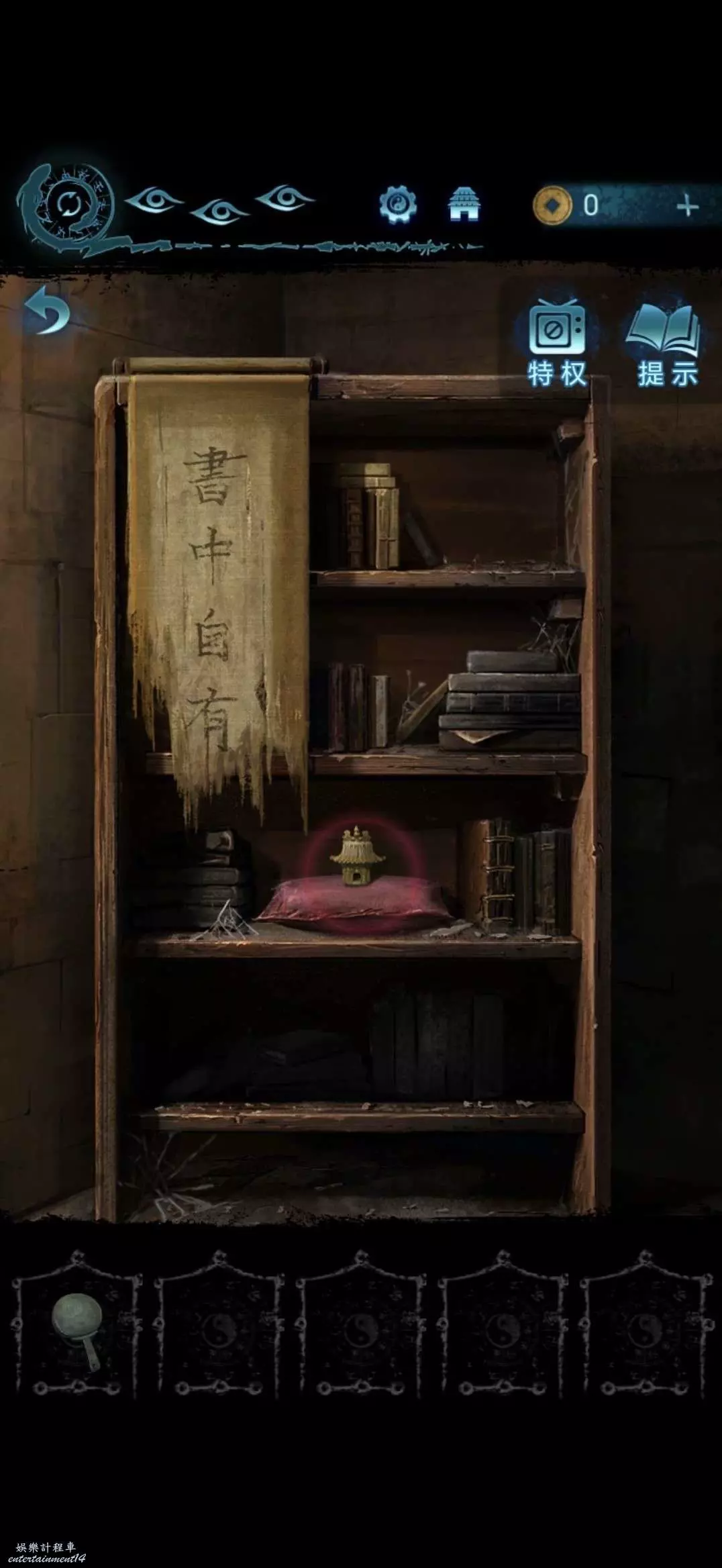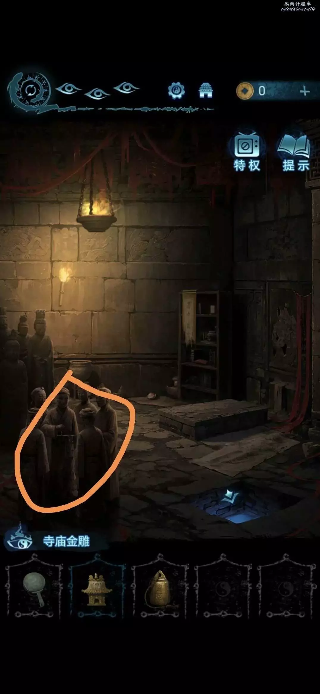 進入地道,點擊右側書架,將寺廟金雕放在軟墊上,獲得咒符