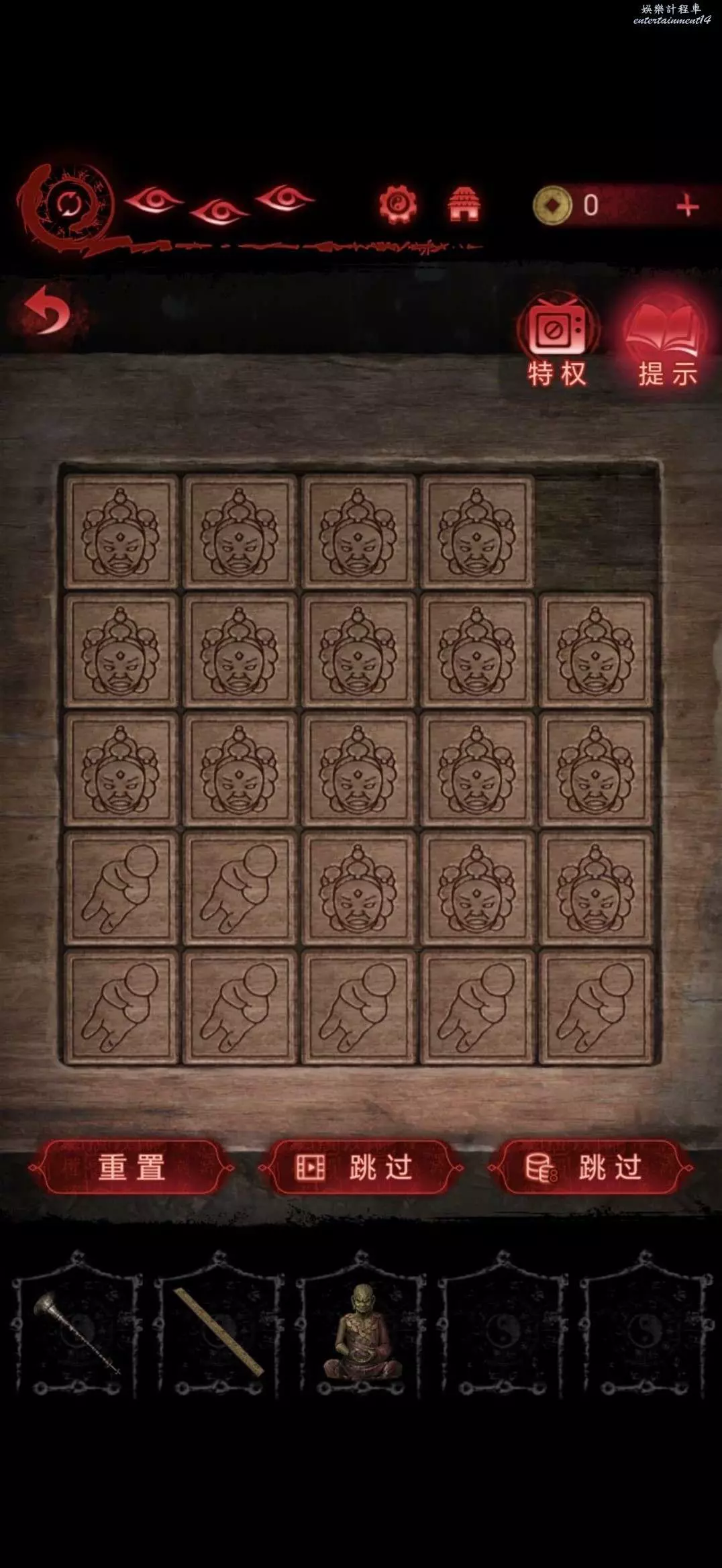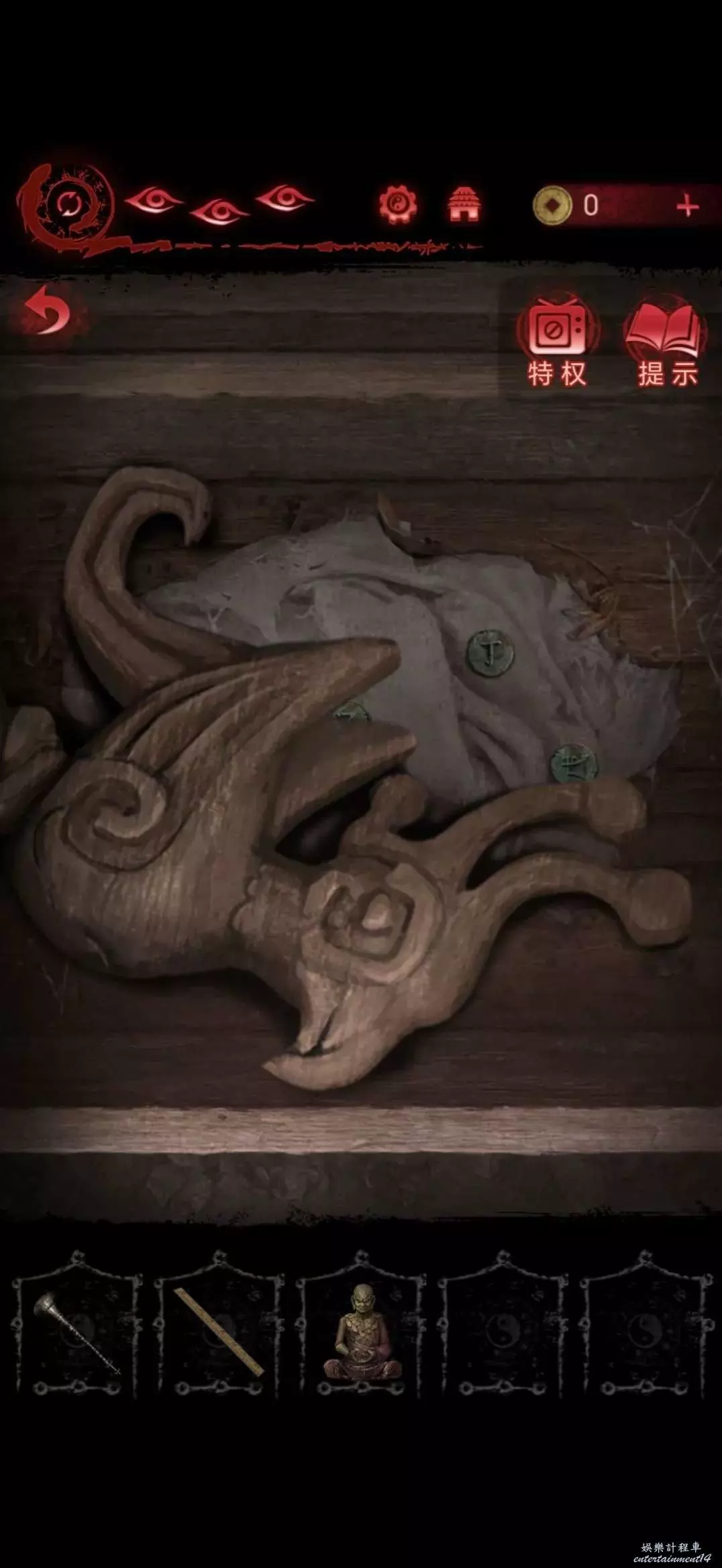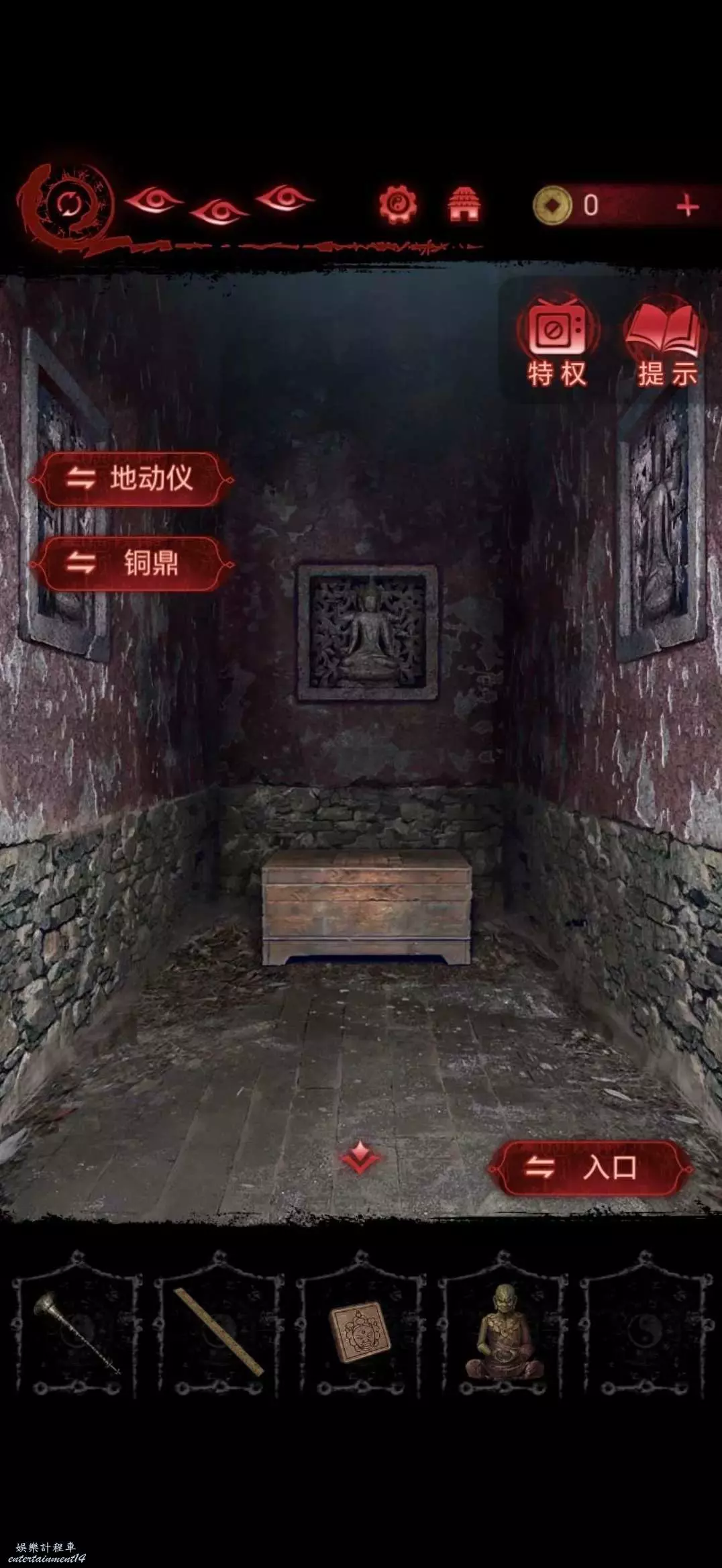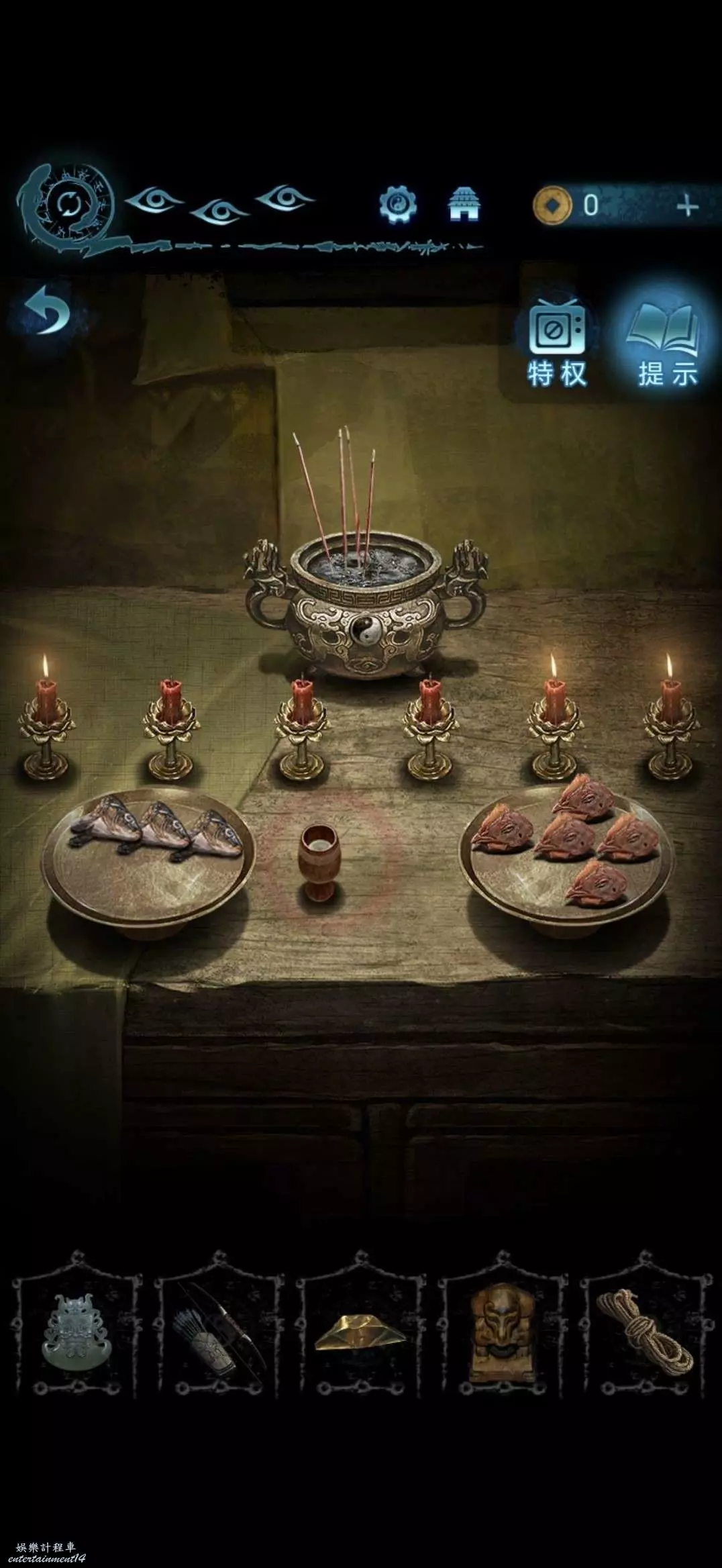 進入地道,點擊右側書架,將寺廟金雕放在軟墊上,獲得咒符