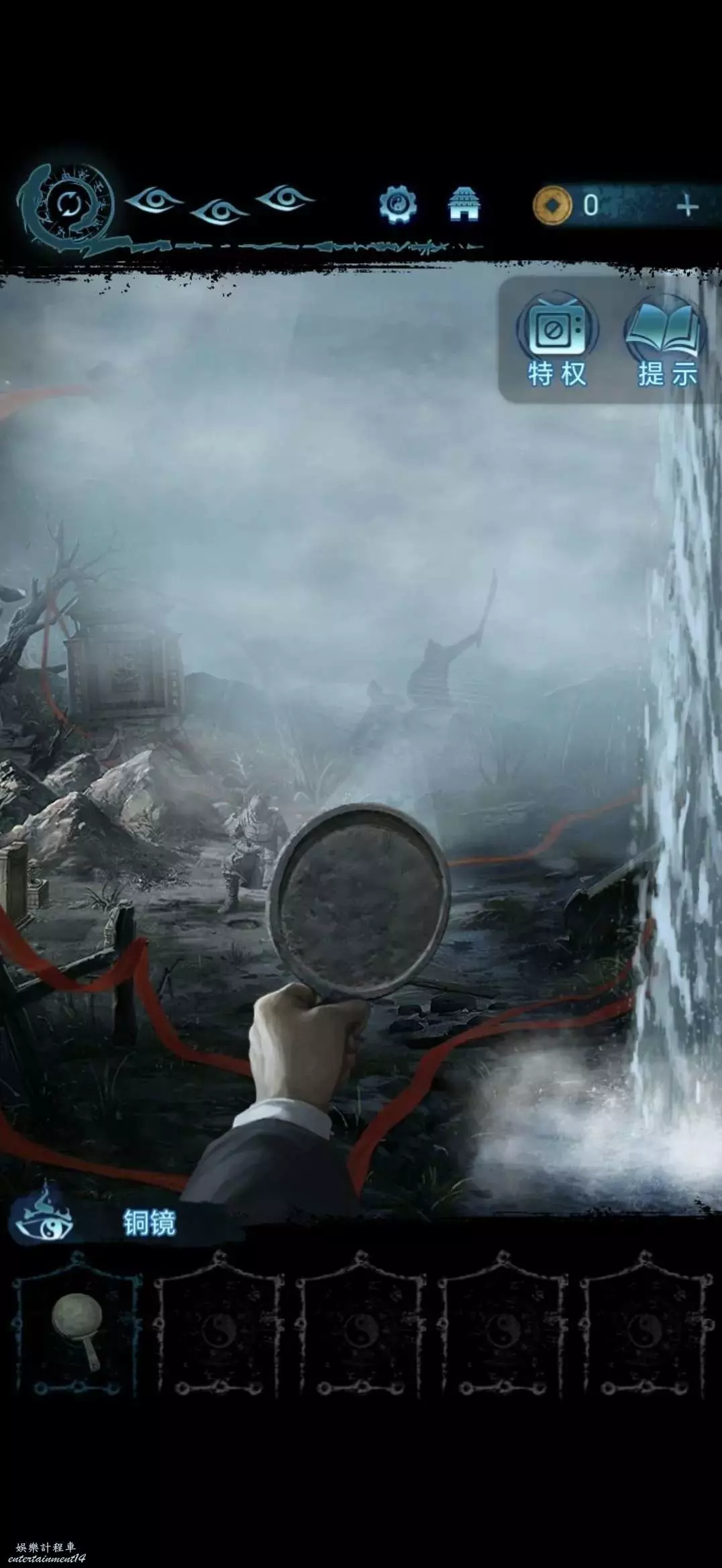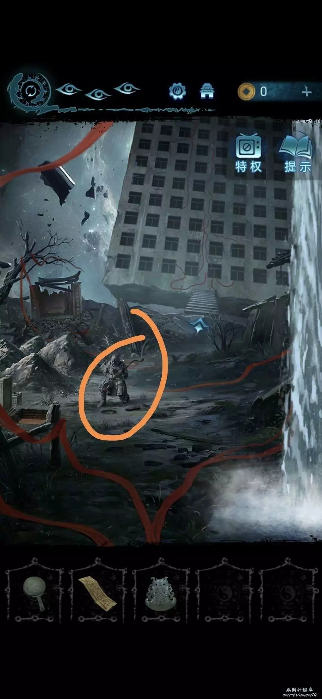 將銅鏡傳送至肖處,切換肖視角,獲得銅鏡,用銅鏡照遠處的人影,顯出一棟樓
