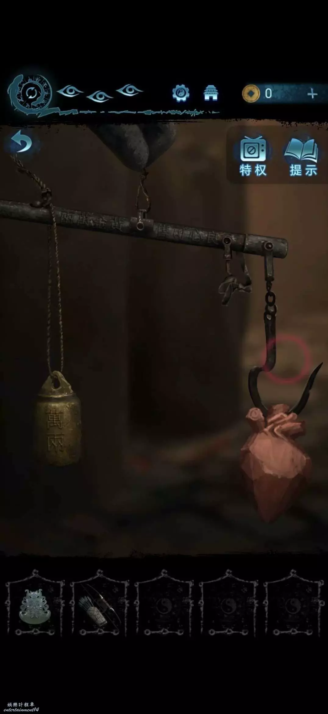 將心形雕塑傳送至肖處,切換肖視角,肖獲得心形雕塑,進入地下室,將心形雕塑也掛在秤上,獲得物欲願,山魈木雕和繩子
