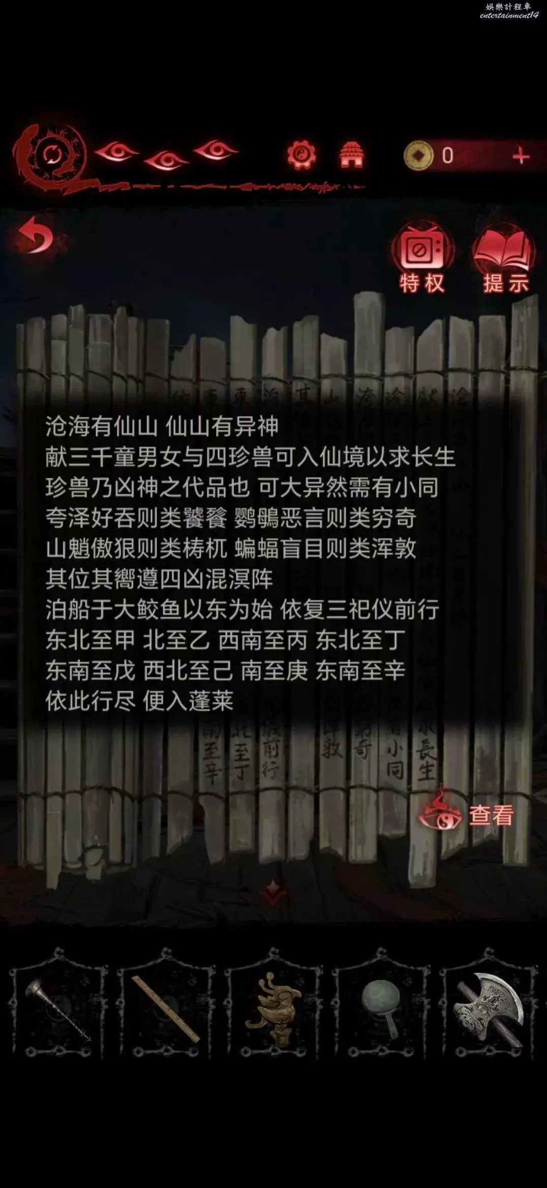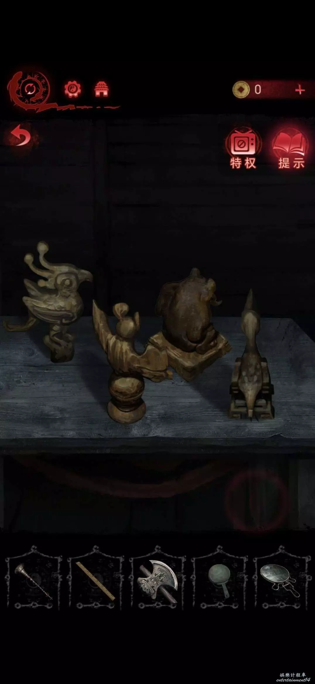 切換肖視角,將山魈木雕傳送至奚處,切換奚視角,奚獲得山魈木雕,按照資料將四個木雕擺在桌子上,獲得長生願
