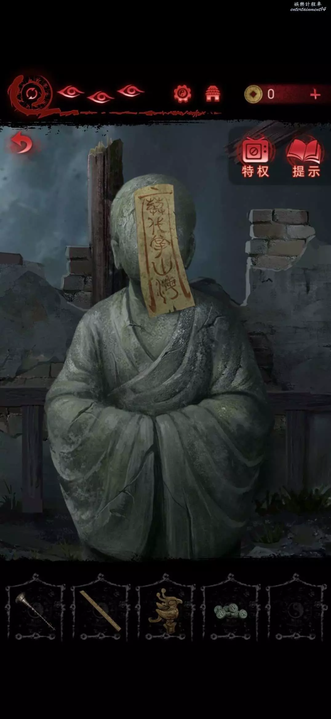 將咒符貼在廟裡右側的石人臉上,獲得青銅球和小銅船
