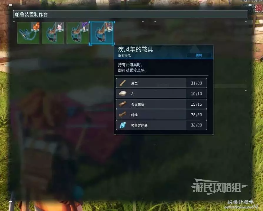 然後在工作台製作對應帕魯的鞍具。以疾風隼為例,捕捉疾風隼後打開科技界面就可以學習鞍具的製作方法。