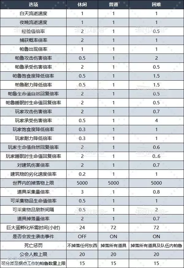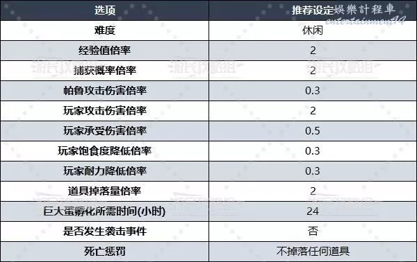 初次接觸生存遊戲的玩家推薦選擇【休閒】難度以擁有最佳的新手體驗,其他設置也可以根據自己的喜好來調整。下方表格在休閒難度的基礎上進行了各項數值的微調。
