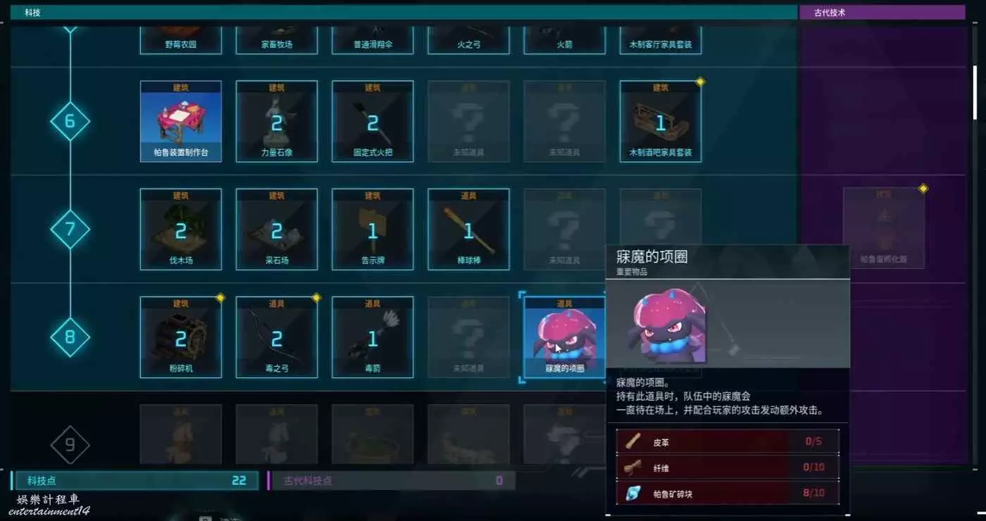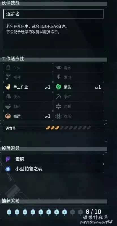 幻獸帕魯 (PalWorld) 前期作戰帕魯推薦 24 1 月 2024-01-24 廣告 作者:鐵板裡脊殲滅者 來源:遊民星空 一開始我們個人是作戰力量的一部分,然後因為只能召喚一隻帕魯所以前期大家比較難受,但是寐魔的獨特夥伴技能可以不受限制,只要我們捕捉到一隻寐魔之後便可以在8級科技中解鎖魅魔項圈,擁有寐魔項圈可以讓隊伍中全部寐魔在場作戰。 寐魔形象和夥伴技能效果 科技樹中寐魔的項圈位置。 寐魔捕捉 寐魔只在夜晚出現,玩家們初始所在的島上就會出現,非常好抓。