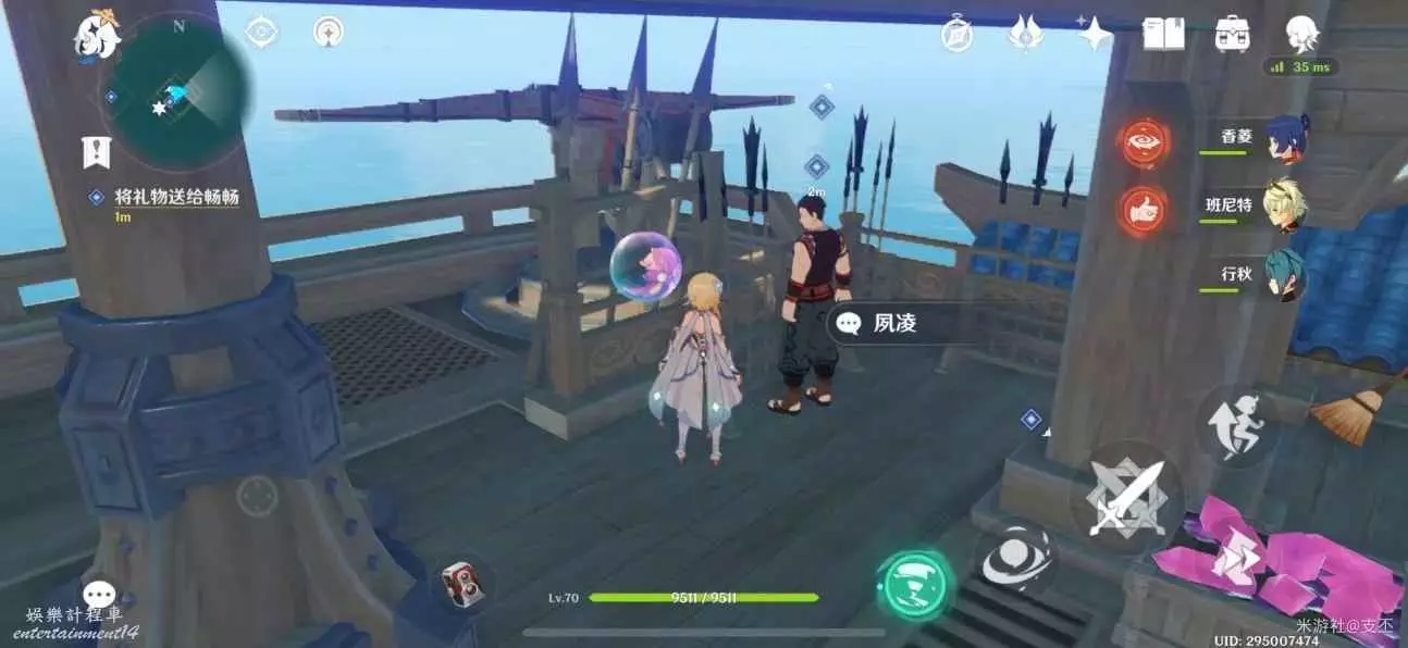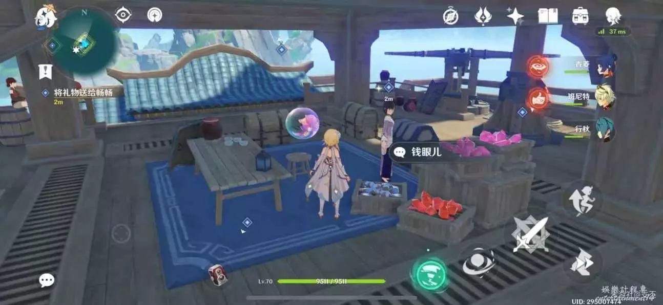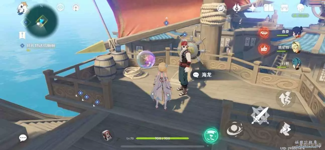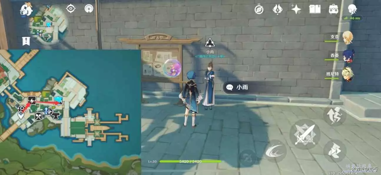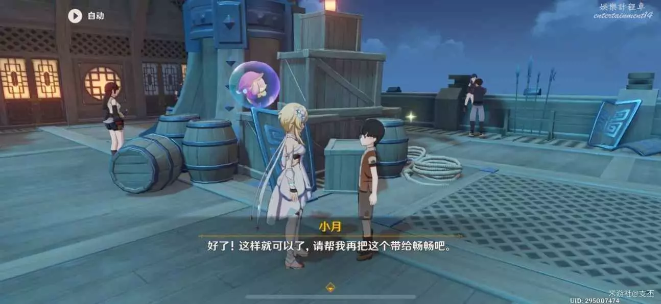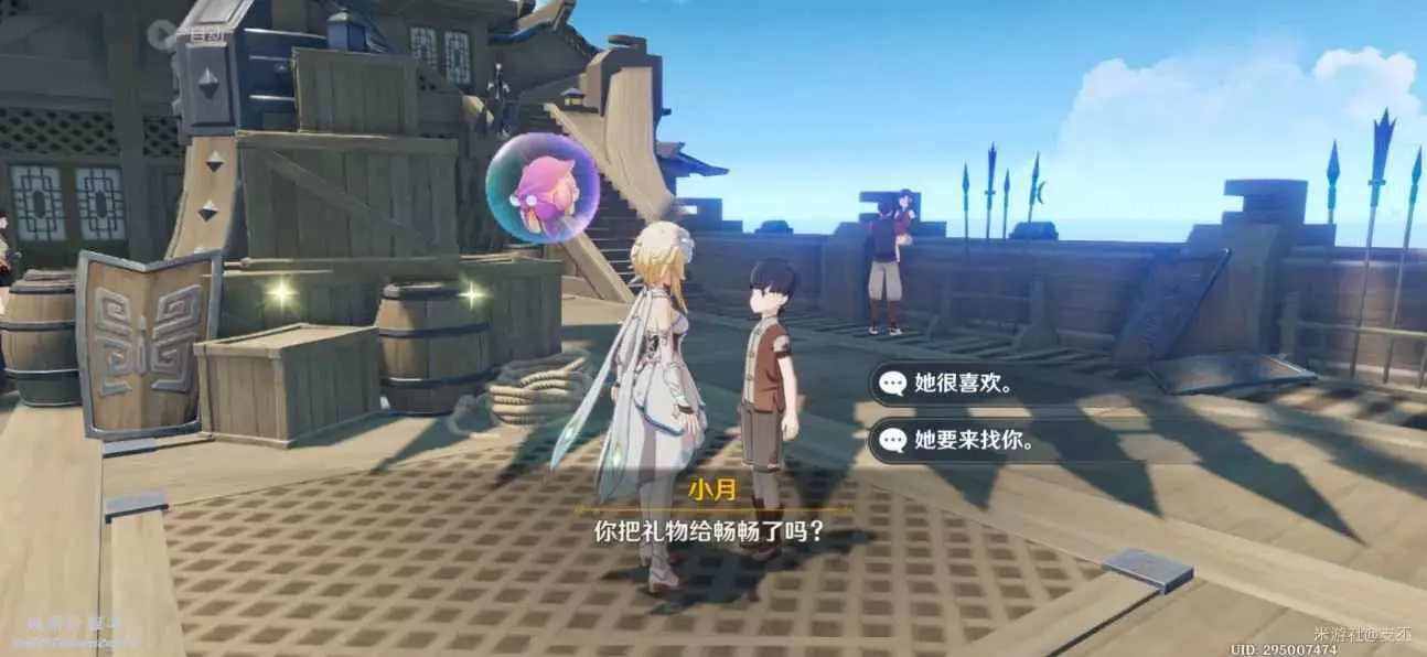 傳送到璃月港,來到碼頭街道上,將小月的禮物送給暢暢,對話得知,這兩小孩的友情非同一般