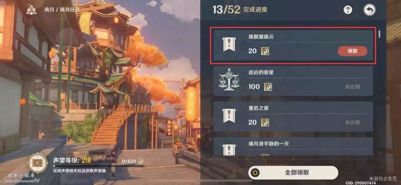 完成孤艦履孤雲任務後,旅行者可以前往「璃月總務司」幹事·小雨處,獲得聲望值+20