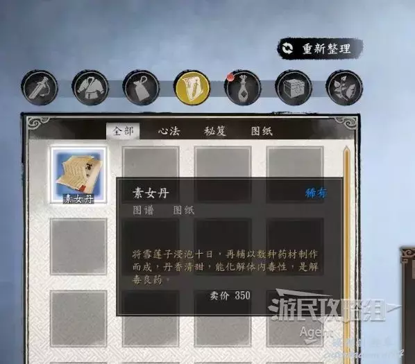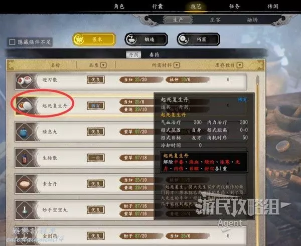 素女丹要在背包裡先使用掉,然後才能在“技藝”一欄進行合成。如果你剛才在谷中各處仔細搜刮過,所需材料是夠的。