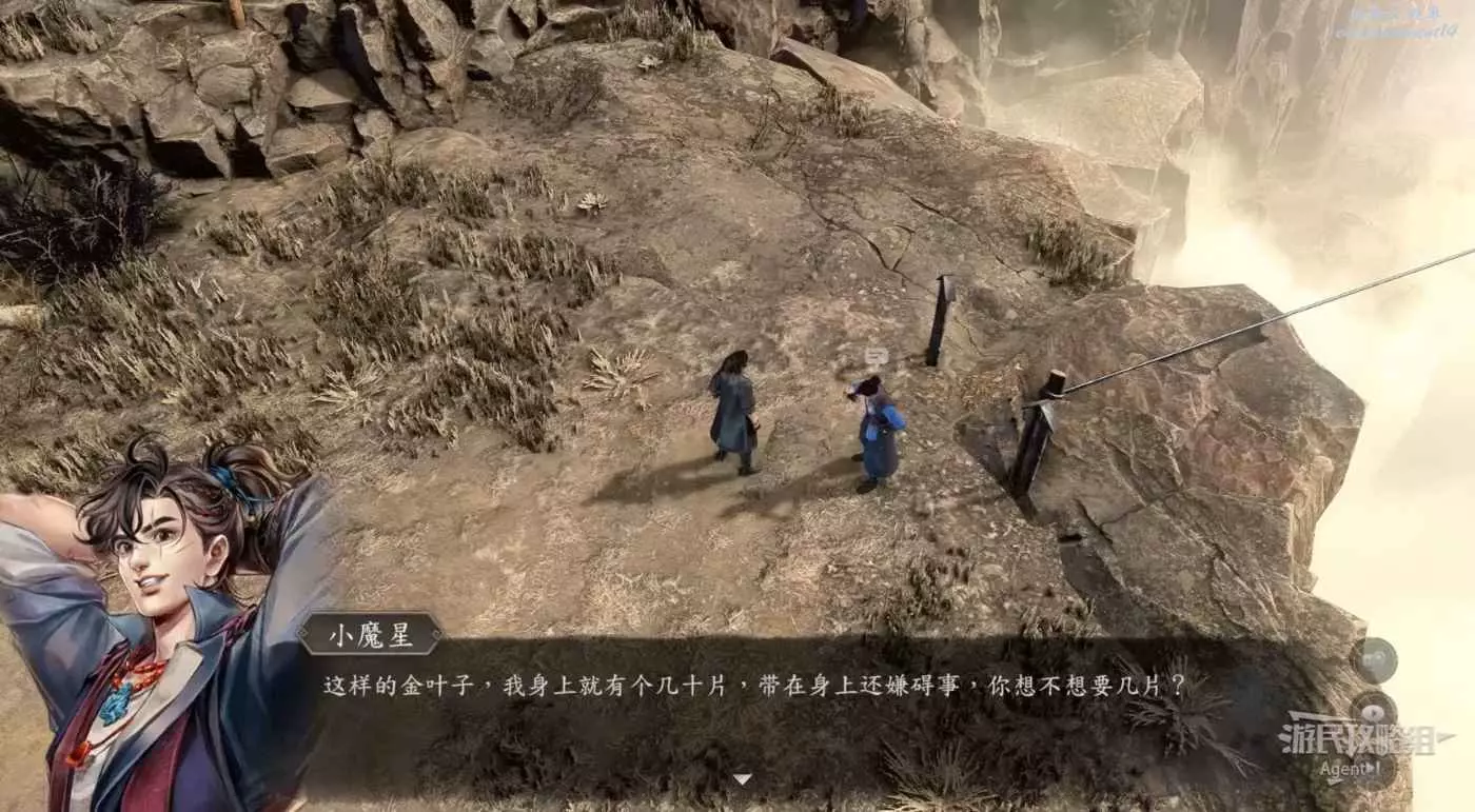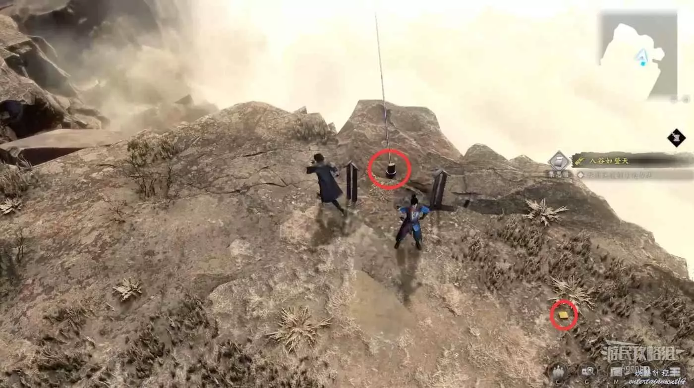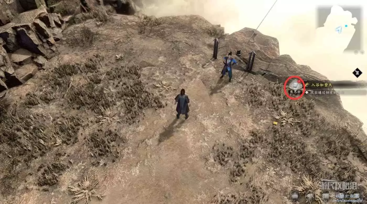來到惡人谷口,地圖上的藍點都是可以對話的人,去聚了一堆人的地方看看。