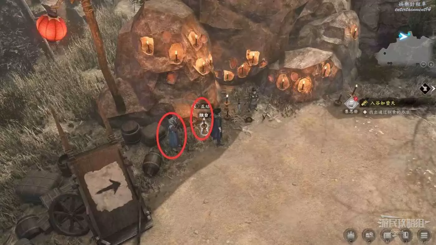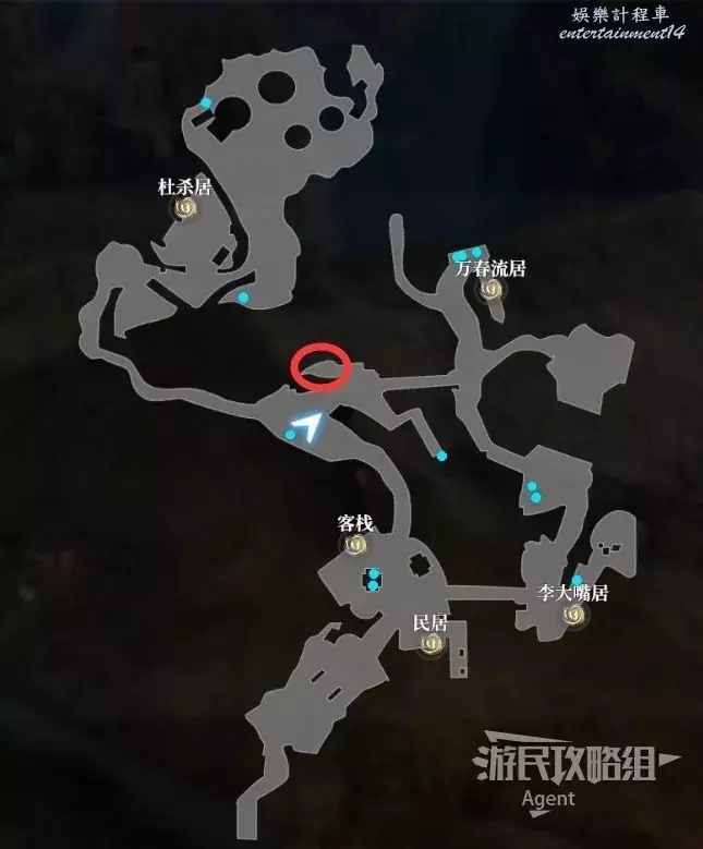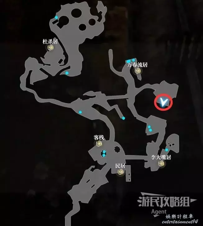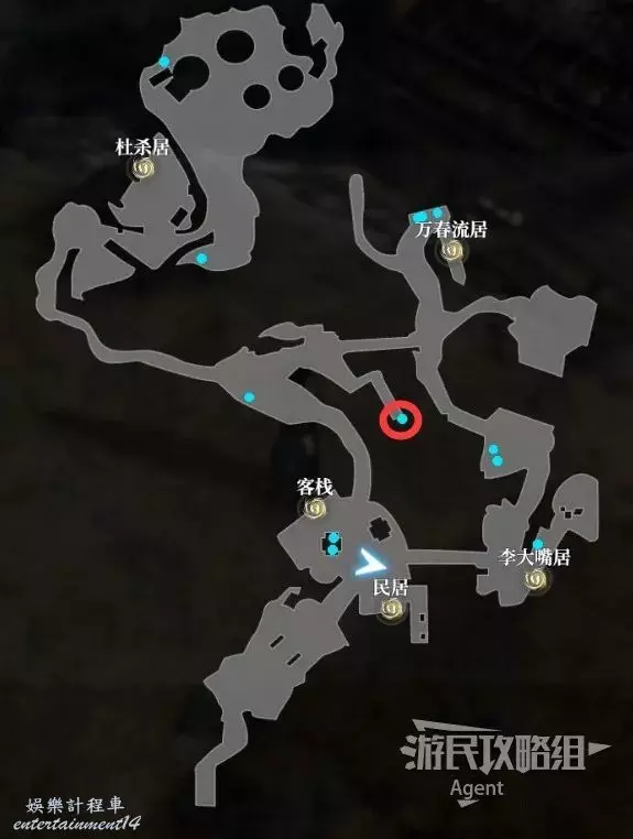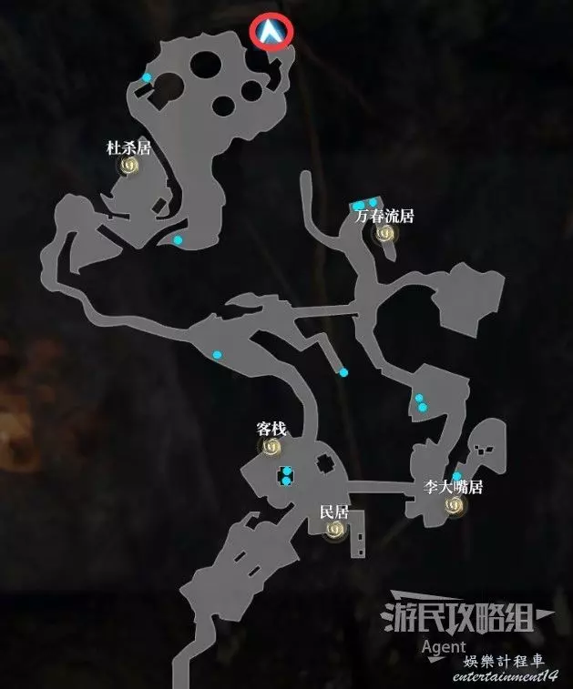 來到惡人谷口,地圖上的藍點都是可以對話的人,去聚了一堆人的地方看看。