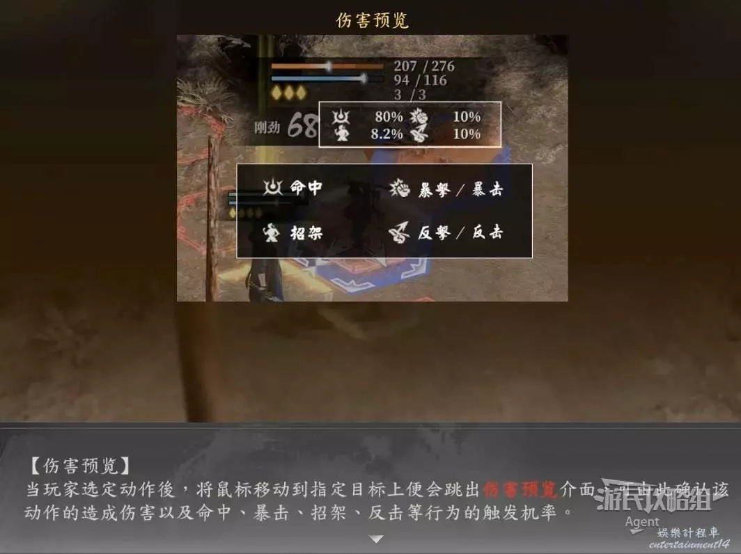 選定招式後,把滑鼠移動到目標上,可查看傷害預覽。