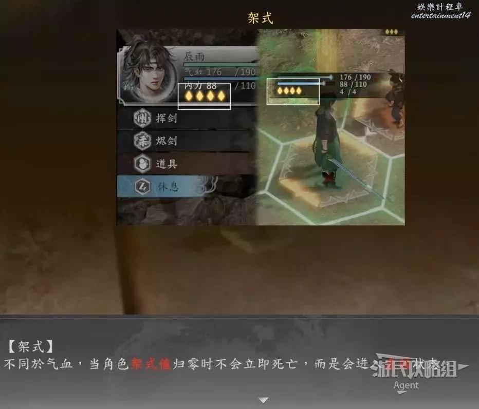 血條和內力條下方的黃色菱形代表架式,架式值歸零會陷入虛弱狀態。