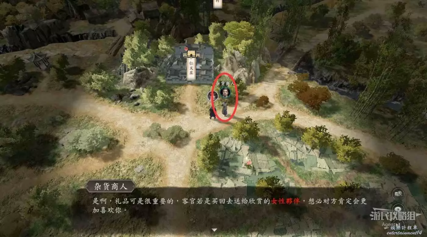 大地圖上有各種商人,遇到雜貨商人的話(仁義莊附近就有一個在徘徊,如下圖),建議把禮物全都買了,留著送小姐姐。