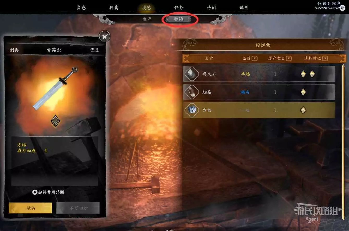 趙老二已經在莊裡了,找他對話解鎖武器融鑄系統。