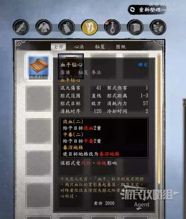 回到杜殺居,用鑰匙開盒子得到【招式秘籍】血手鑽心。這是血手杜殺的成名絕技。