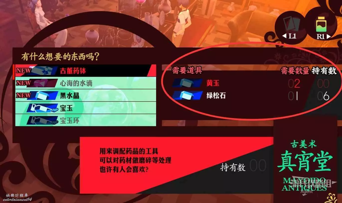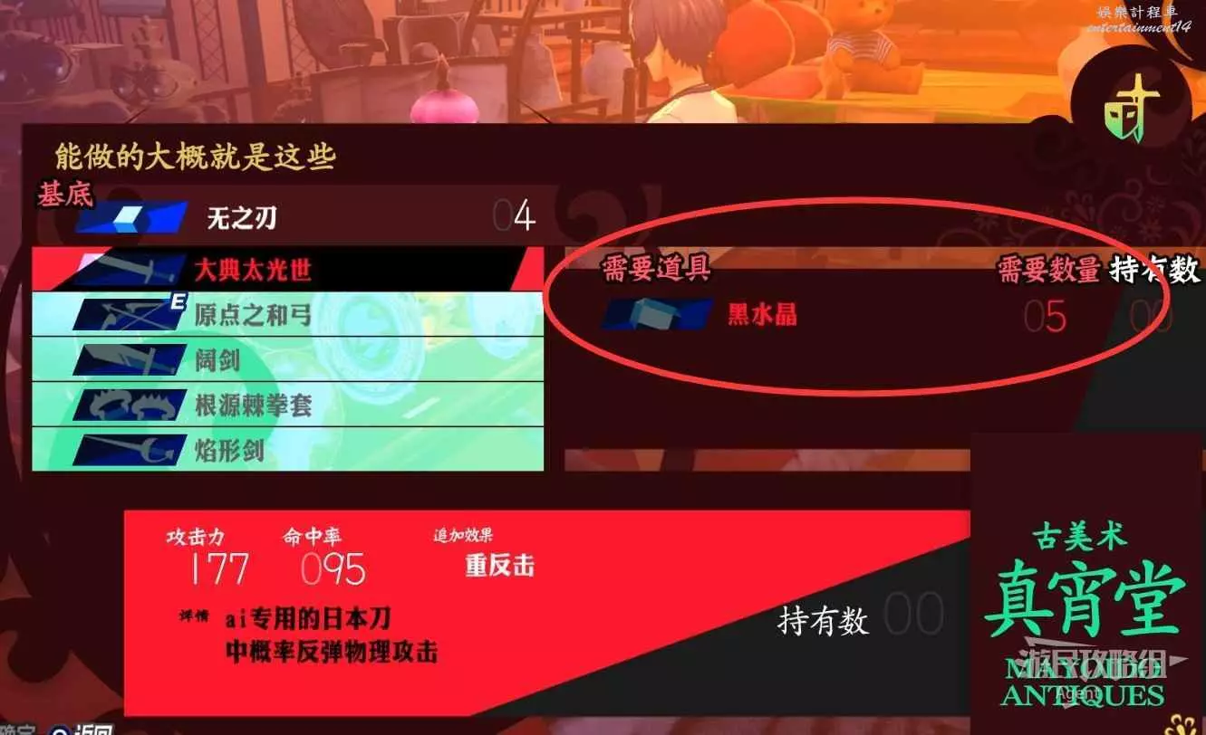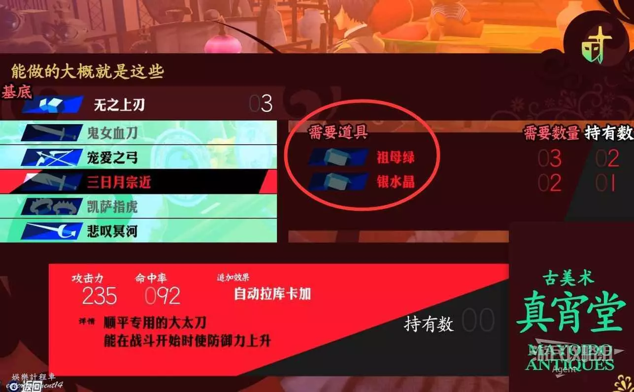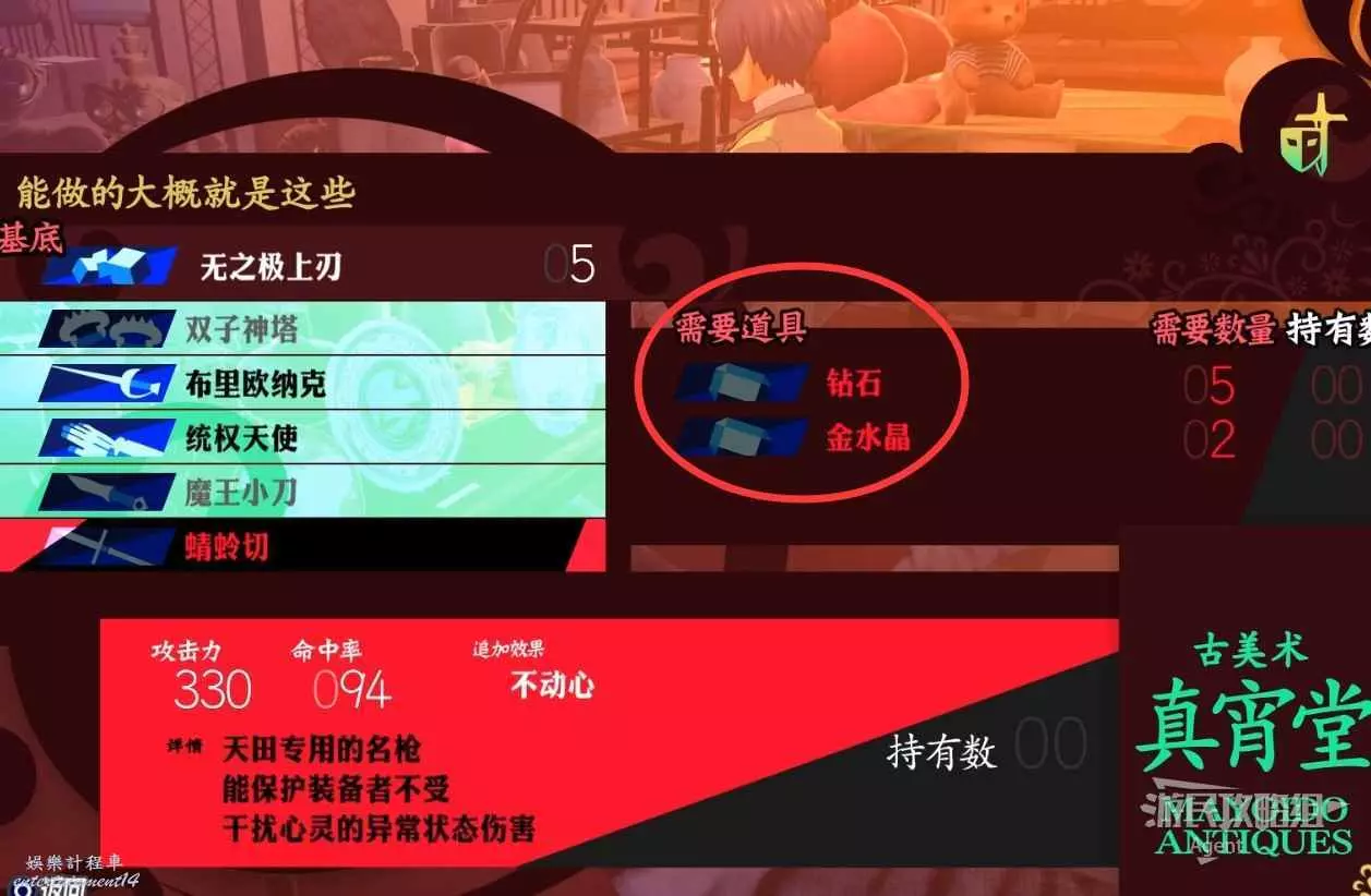 委託91,去古董店合成蜻蛉切,需要鑽石、金水晶,等下爬塔就能刷到。