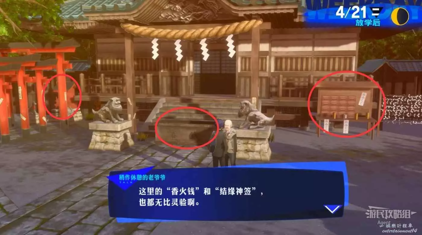 長鳴神社有三個設施:在稻荷祠堂祈禱可以複製技能卡,參拜香火錢可以增加學力,結緣神籤用於修補社群的好感度(等好友缺好感度的時候再用)。