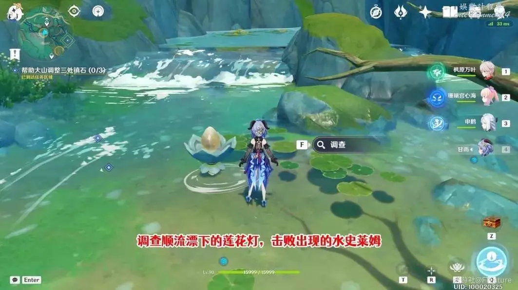 接下來我們靠近這個漂下來的蓮花燈並調查,調查後會出現幾隻水史萊姆,將它們擊敗。
