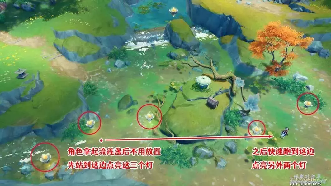 這裡我們需要使用流蓮盞的光芒,在短時間內點亮附近全部的5個蓮花燈,完成方法大致有以下兩種
