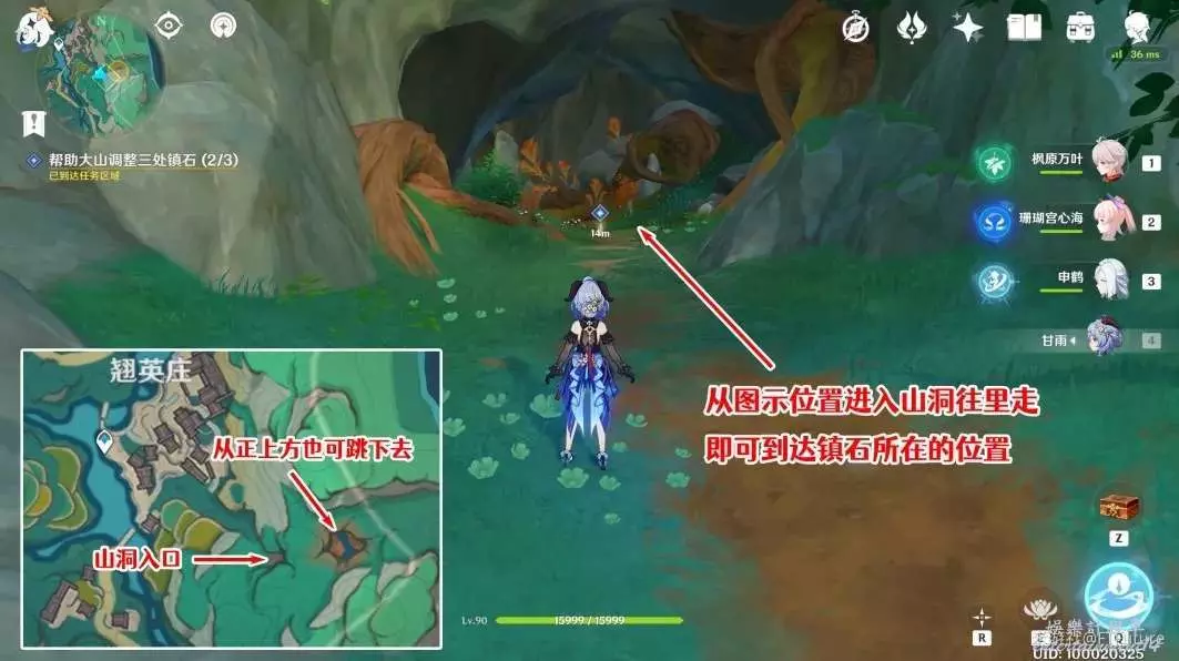 鎮石3位於一個山洞中,可以從下圖所示位置的入口進去,也可以走到正上方跳下去。
