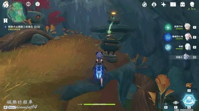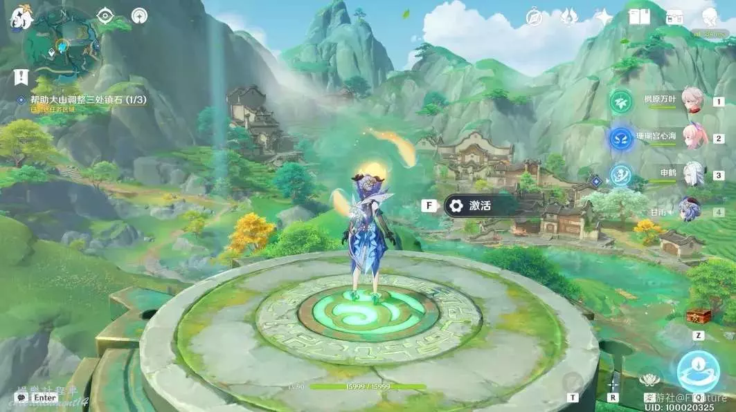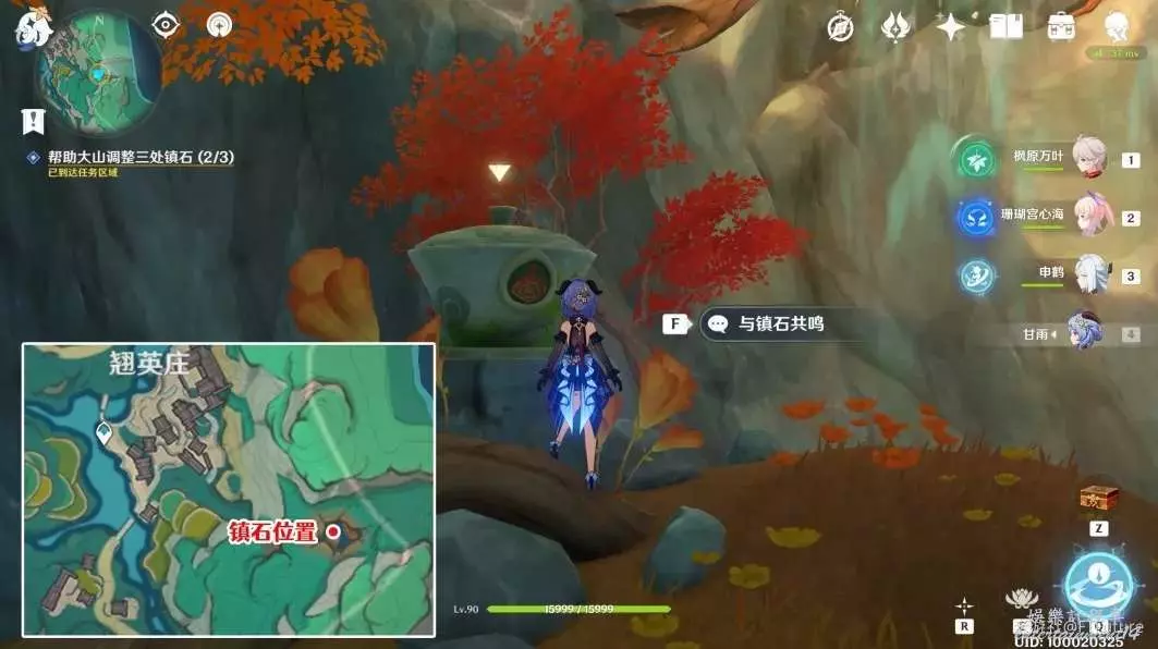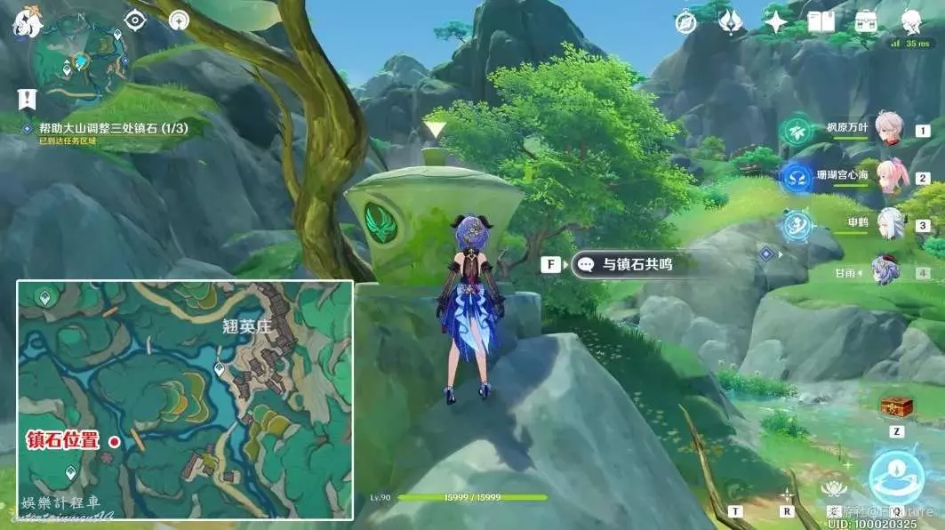 到下圖所示位置,與這裡的鎮石互動共鳴。共鳴後,西南邊這裡的蓮花燈就會順著水流飄下來。