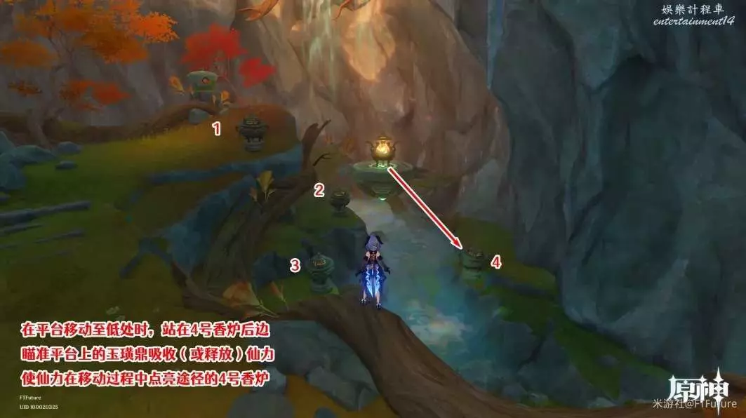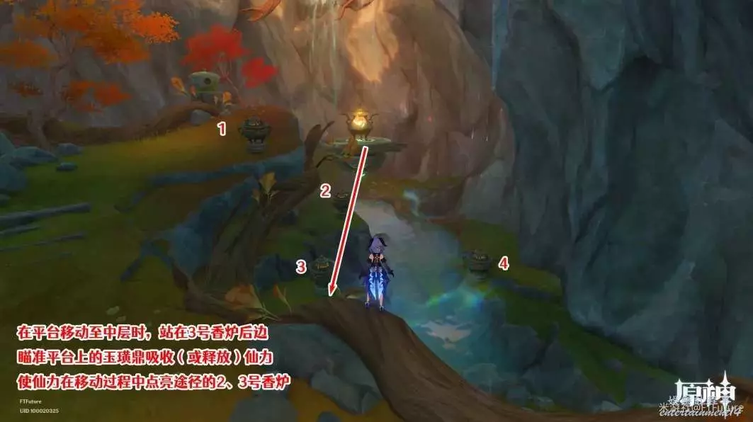 最後站到4號香爐後面,在移動平台移動至最低處時,按T吸收(或釋放)仙力,仙力在移動時就會點燃途徑的4號香爐。