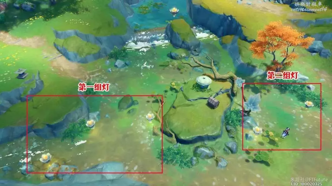 1. 角色自身攜帶流蓮盞,站到其中一組燈旁邊,點亮後快速跑到另外一組燈旁,點亮剩下的燈;