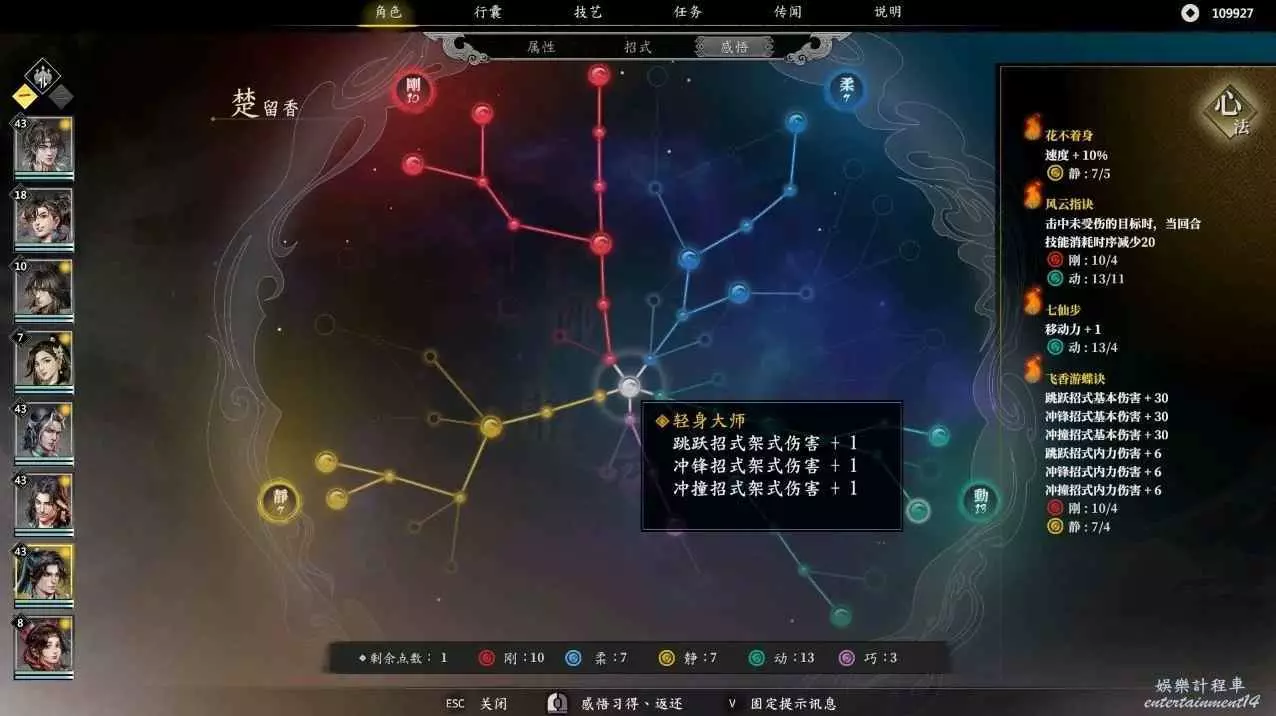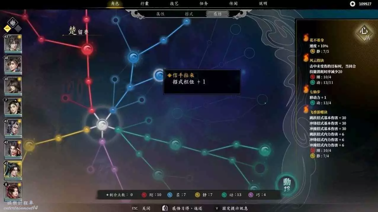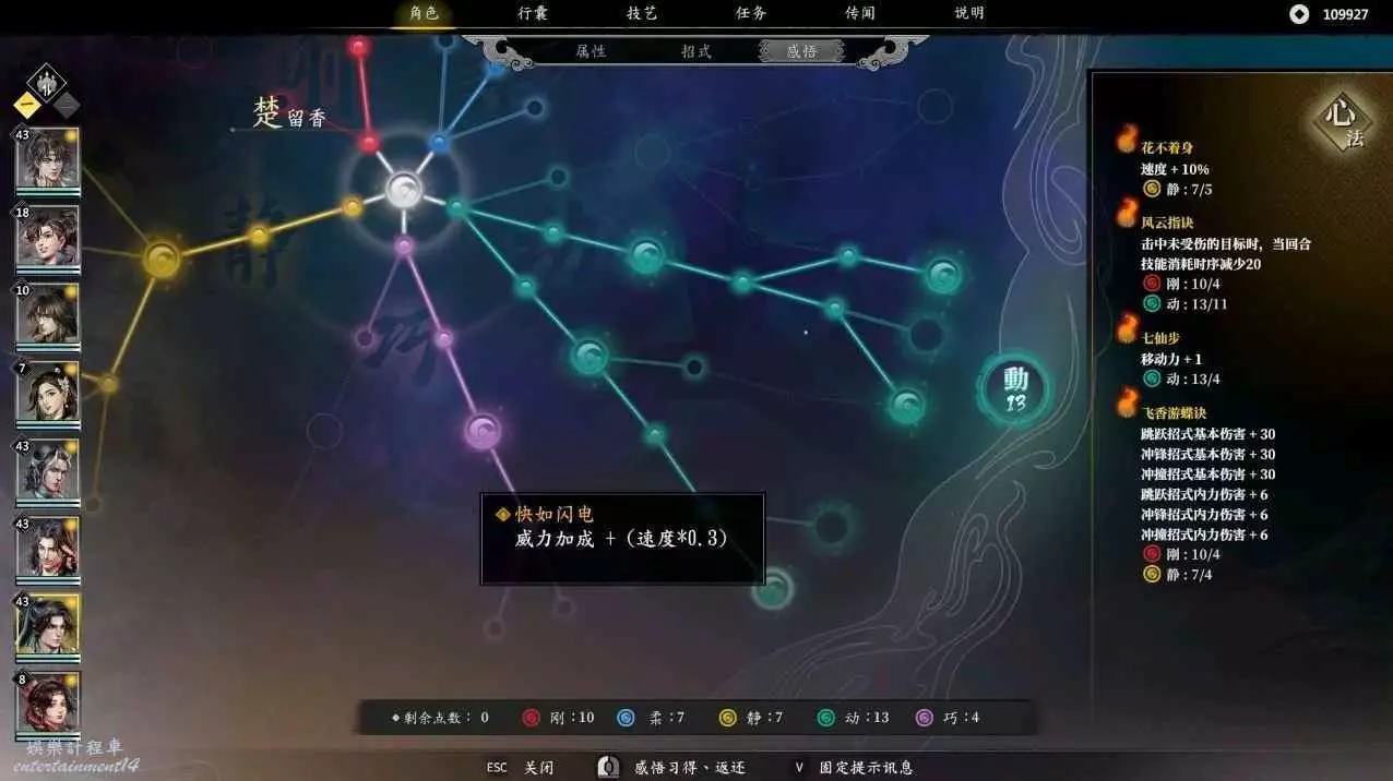 招式目前就是這樣子,再加幾點巧點出第二個信手拈來就可以多用一個盜帥夜留香,至於剩下的感悟可以看自己喜好加