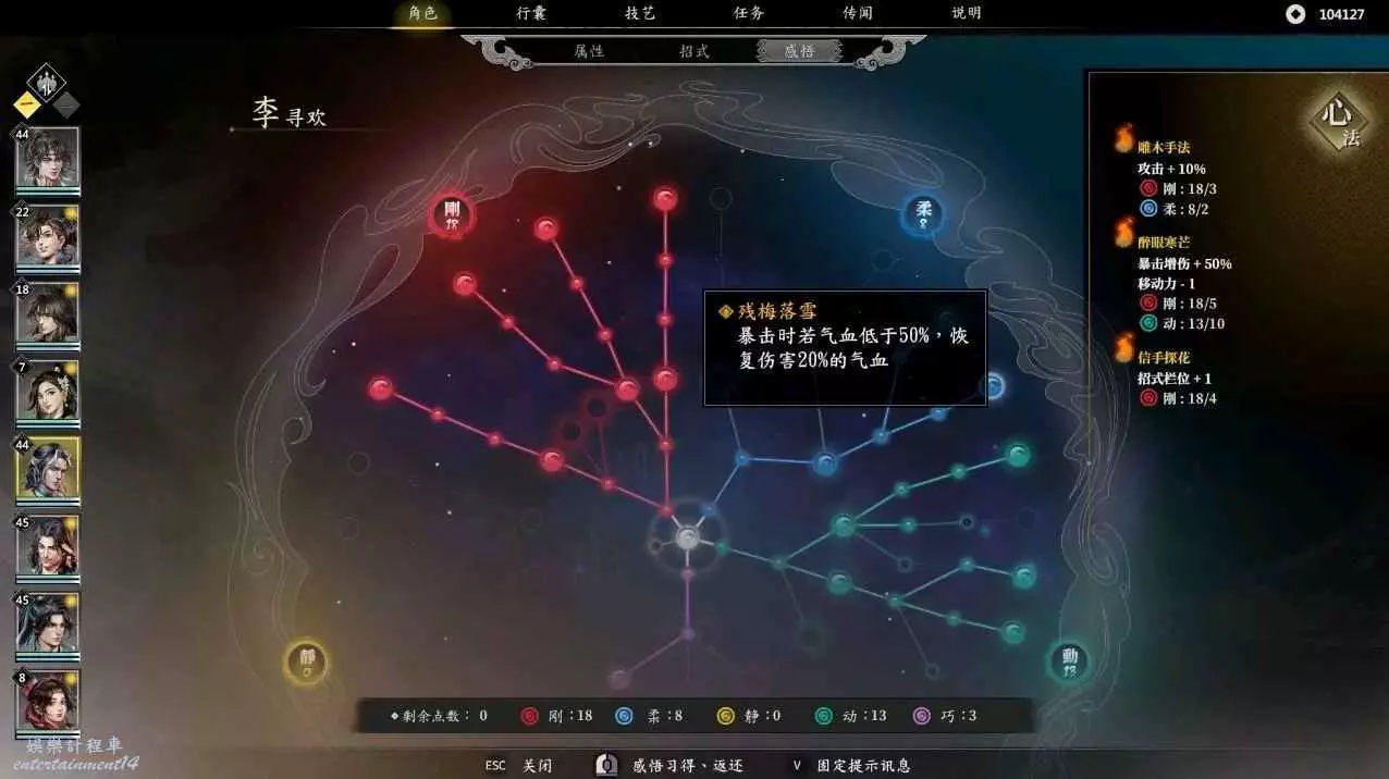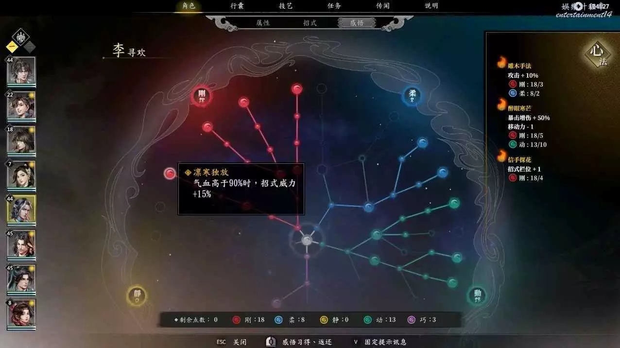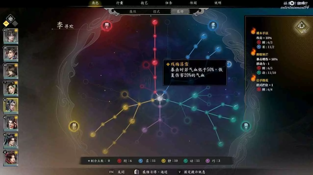 由於李尋歡在二十四級會多一個技能梅花三弄,所以需要抓緊時間搞個技能欄位出來,此時便可以先點亮相機應變,後點信手拈來,就可以在24級獲得五個技能欄,再點亮明察秋毫,接著點凝氣一擲,在柔點上兩點,目前三大心法全部啟動,最後可以按照自身喜好講寒梅獨秀,殘梅落雪,凜寒獨放依次啟動