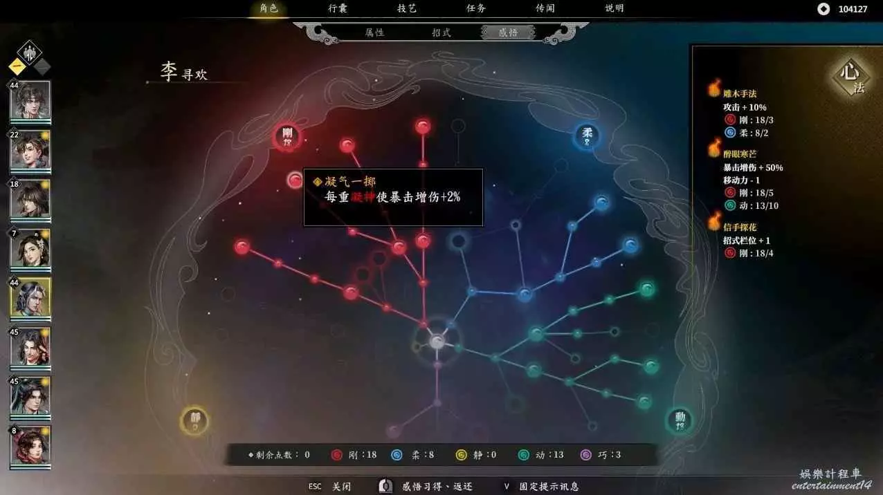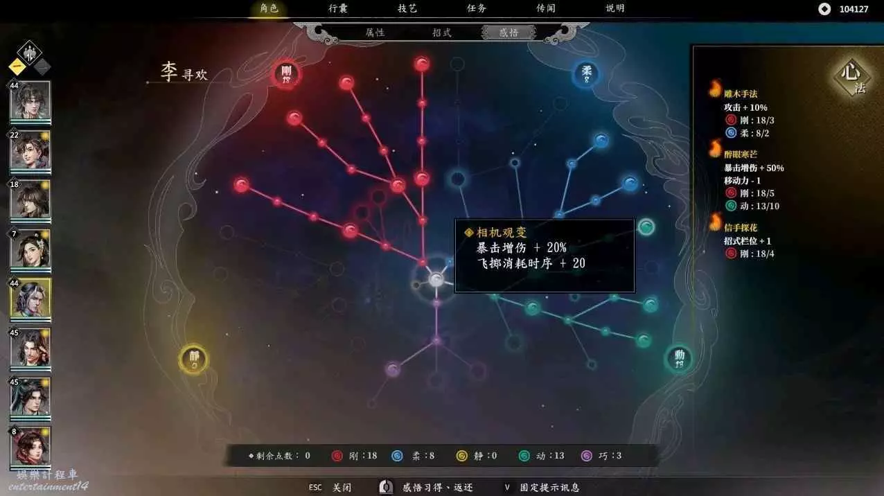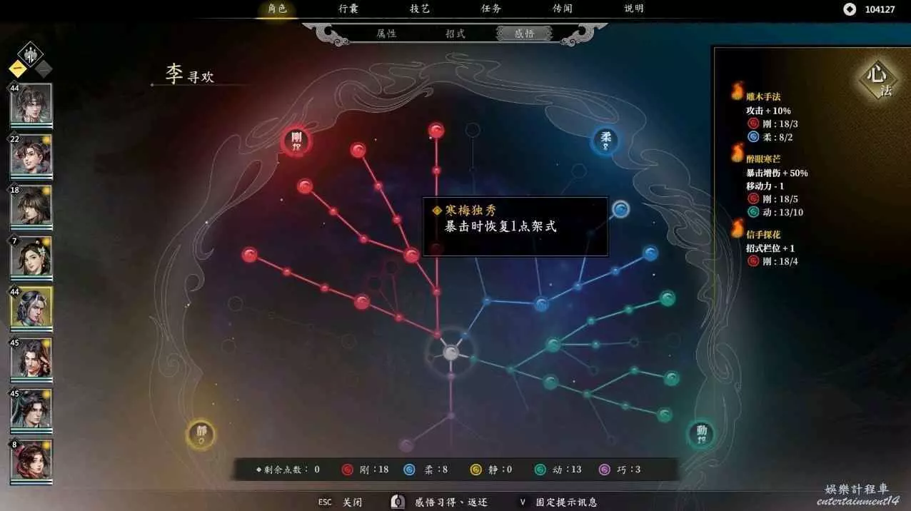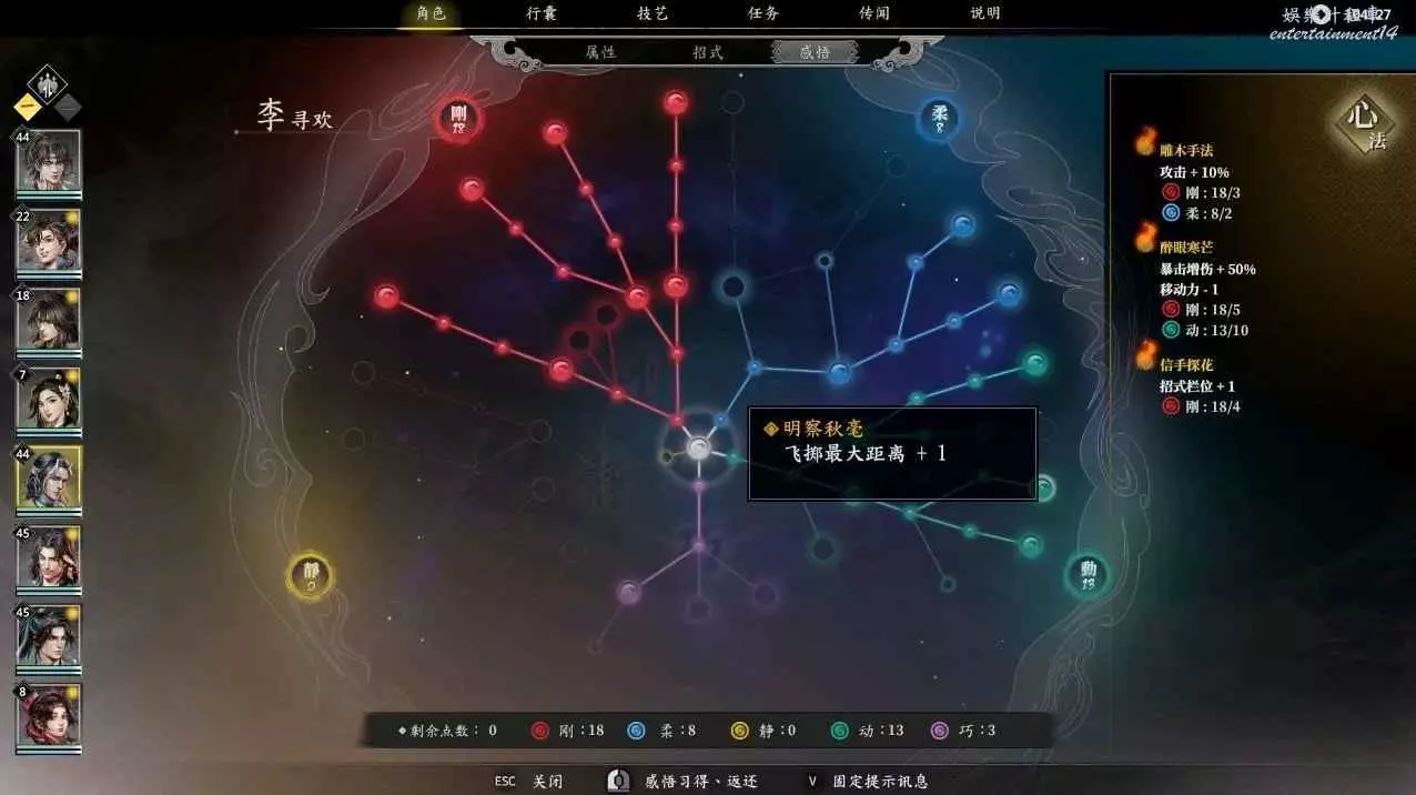 由於李尋歡在二十四級會多一個技能梅花三弄,所以需要抓緊時間搞個技能欄位出來,此時便可以先點亮相機應變,後點信手拈來,就可以在24級獲得五個技能欄,再點亮明察秋毫,接著點凝氣一擲,在柔點上兩點,目前三大心法全部啟動,最後可以按照自身喜好講寒梅獨秀,殘梅落雪,凜寒獨放依次啟動