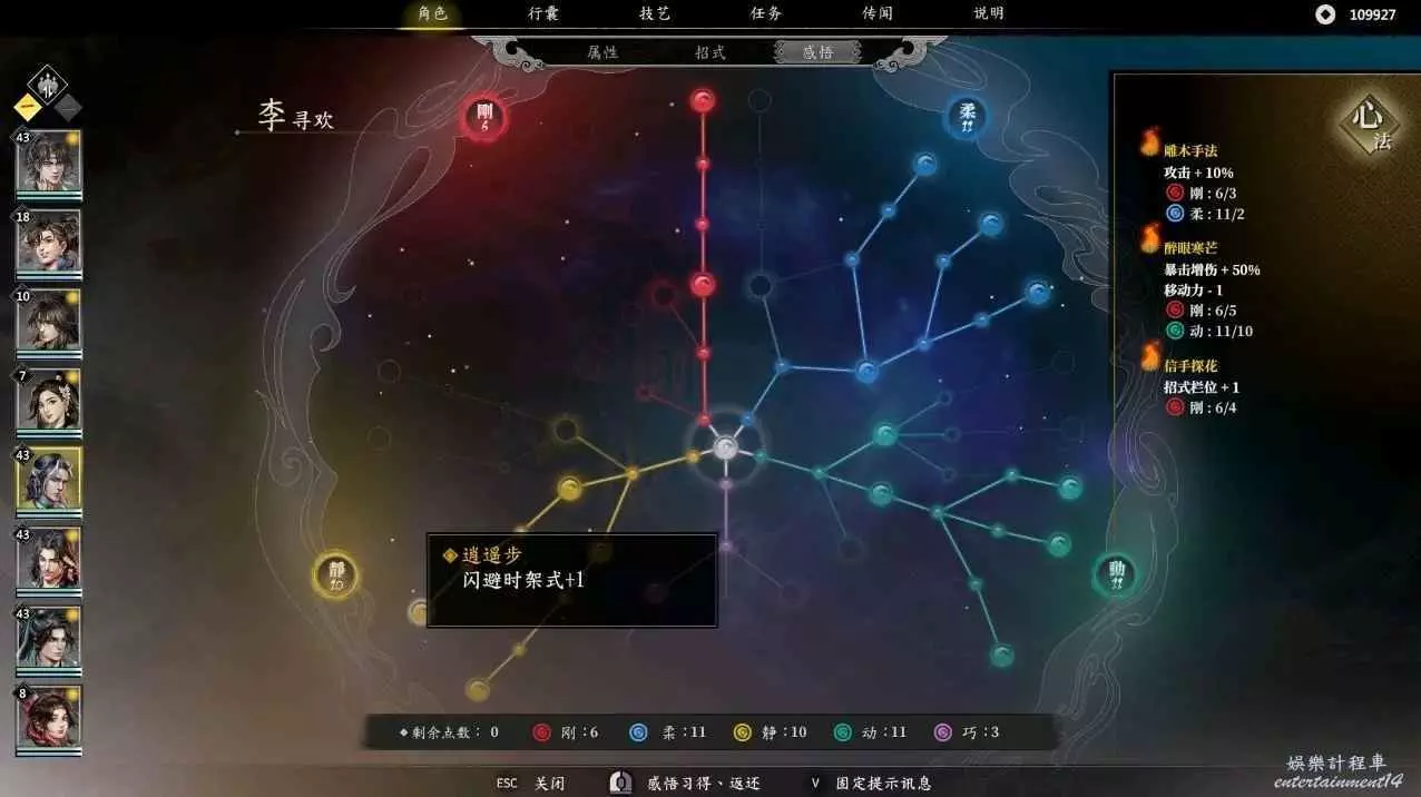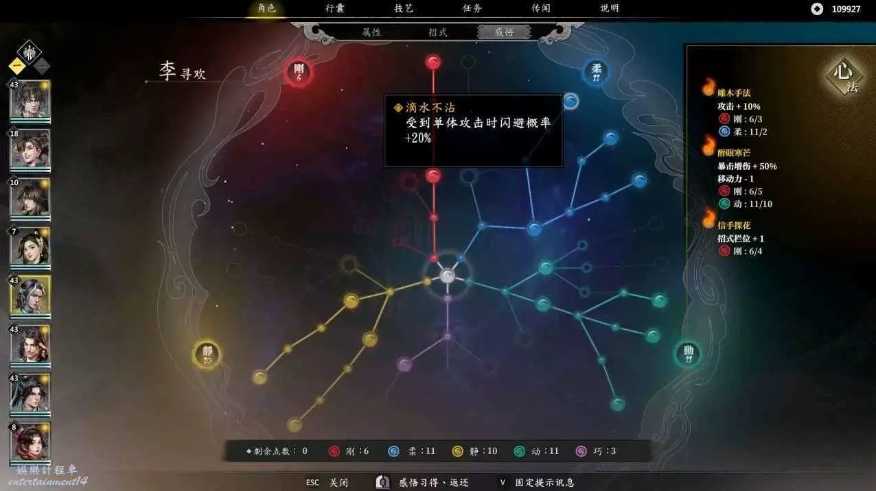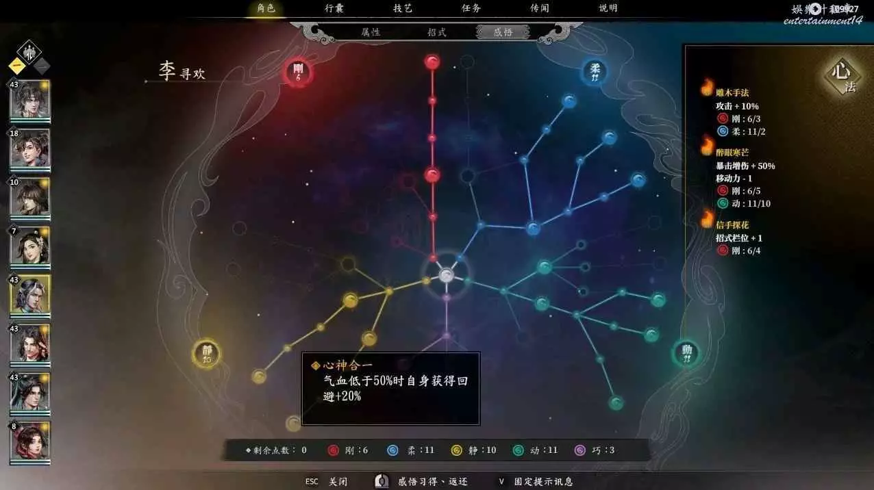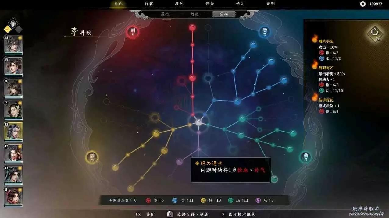 這是閃避流的加點和必要感悟,先分析一下這個流派,常態閃避90%,暴擊55%,暴擊,閃避後加架式,半血以下110%的閃避,還有吸血,回血,回內,你只要注意好占位,我很難想像李尋歡怎麼死!