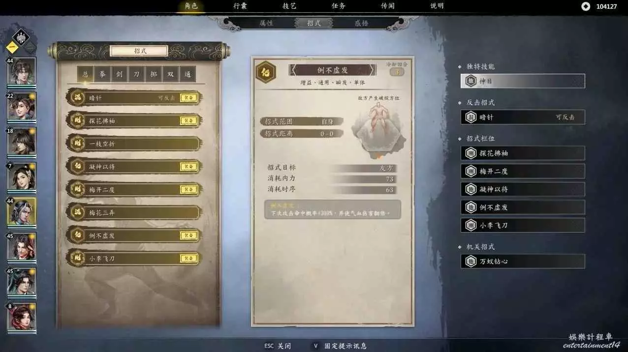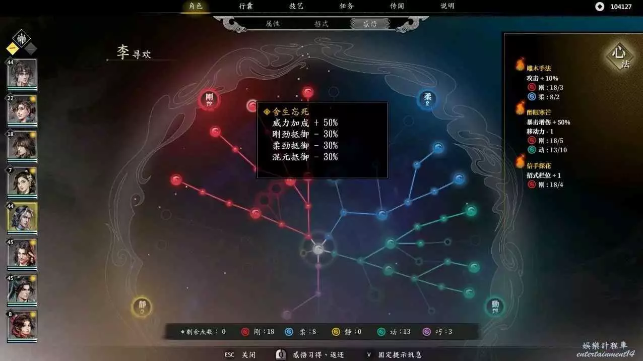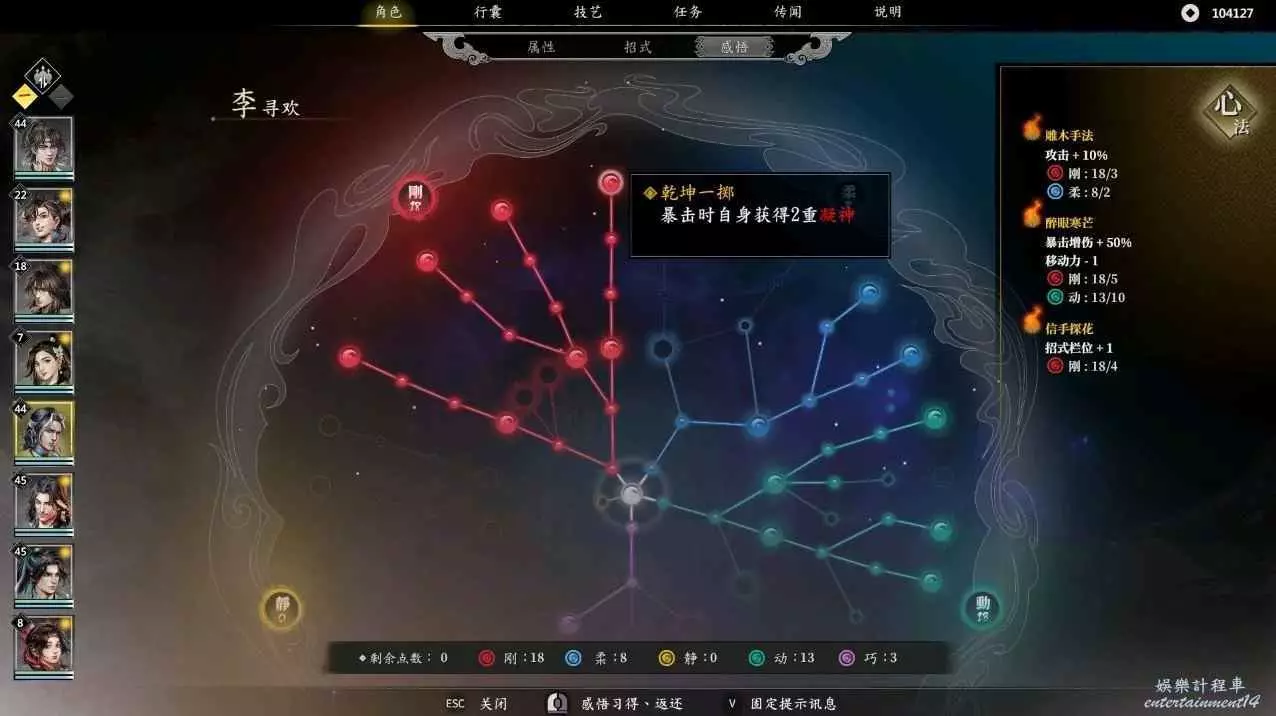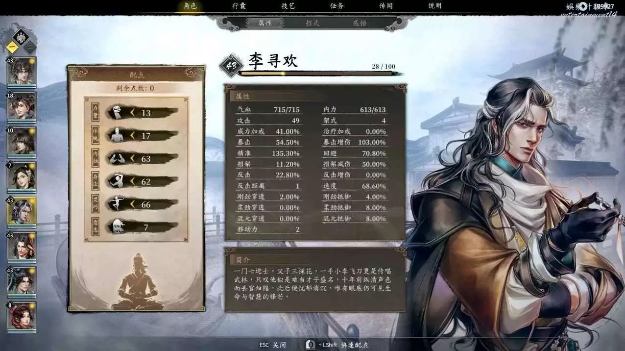這是閃避流的加點和必要感悟,先分析一下這個流派,常態閃避90%,暴擊55%,暴擊,閃避後加架式,半血以下110%的閃避,還有吸血,回血,回內,你只要注意好占位,我很難想像李尋歡怎麼死!