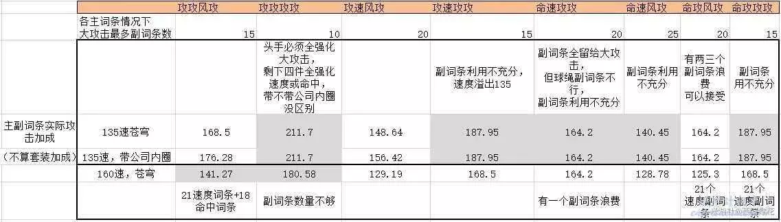 (仔細觀察就能發現,在135速檔位元,命中衣和速度鞋是造成詞條浪費的罪魁禍首。雖然它們能快速達到120命中/135速閾值,但在大畢業詞條的情況下,帶了後就只需再出7個命中/10個速度副詞條,拋開初始詞條裡的命中/速度後,幾乎沒有了強化需求,這給強化帶來了極大限制。二者同時帶更是炸裂)