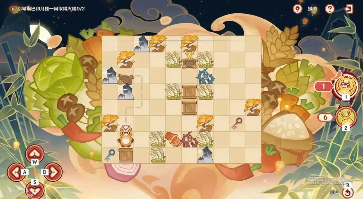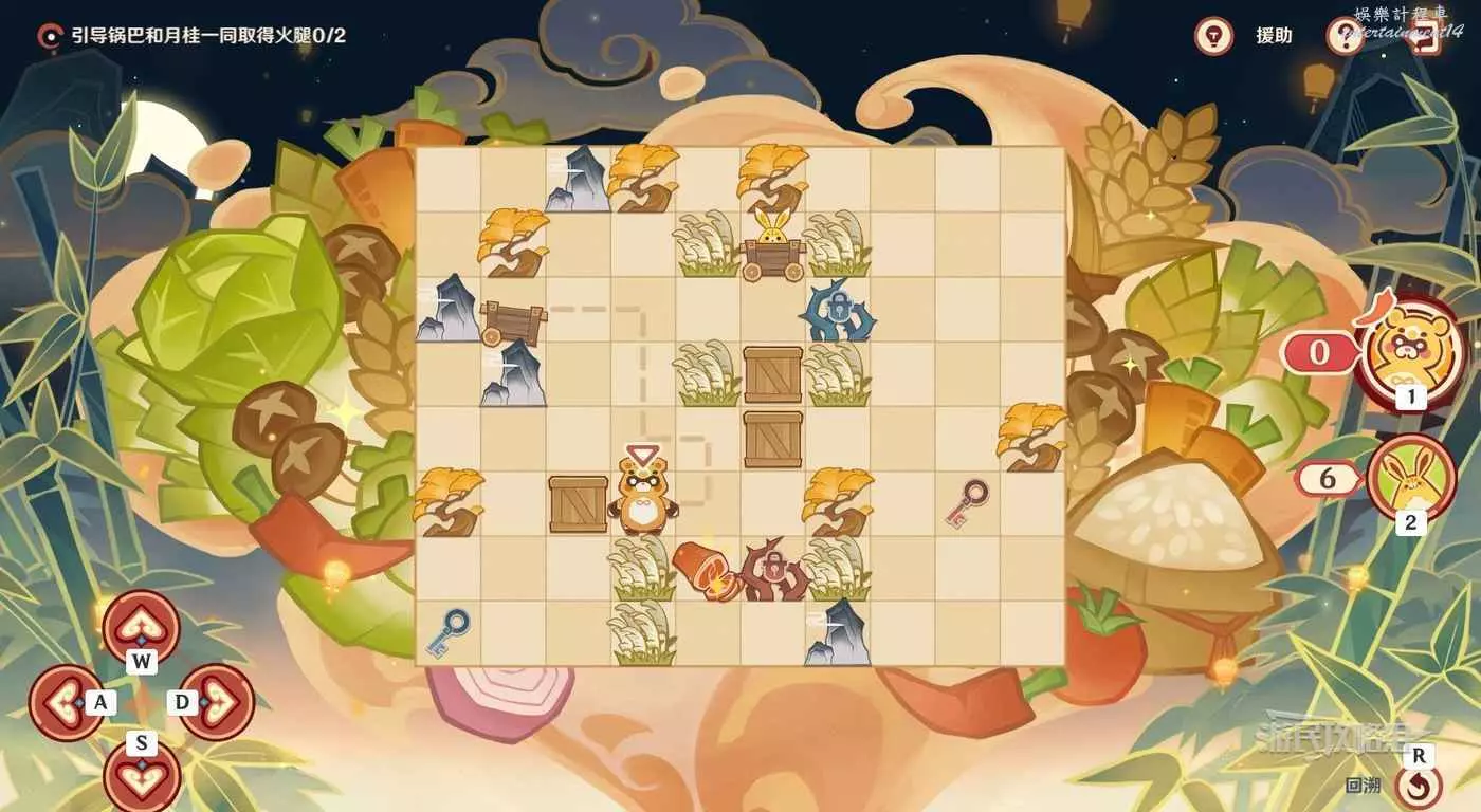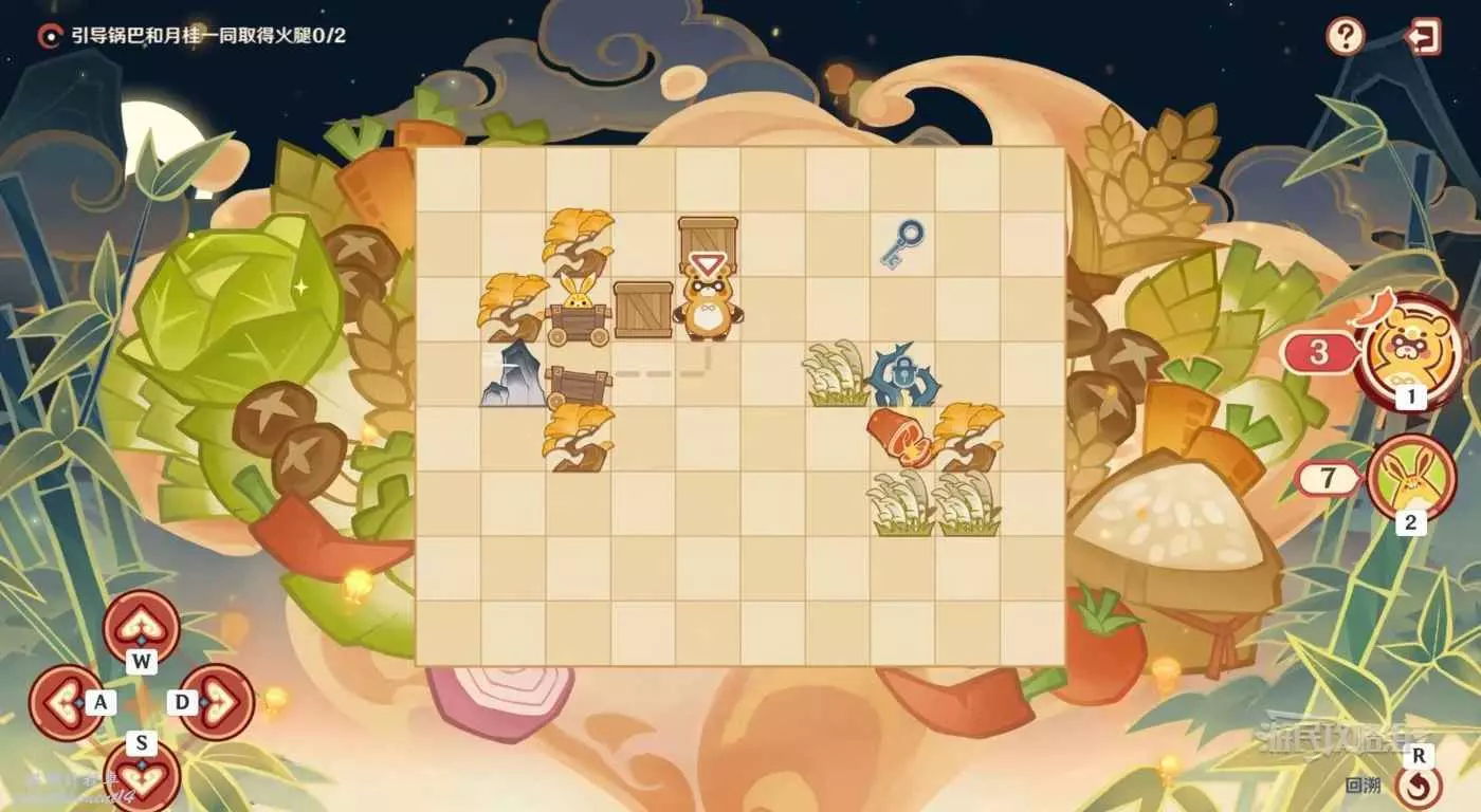 操作鍋巴往回走三格,走最近的路線推箱子拾取到藍色鑰匙。