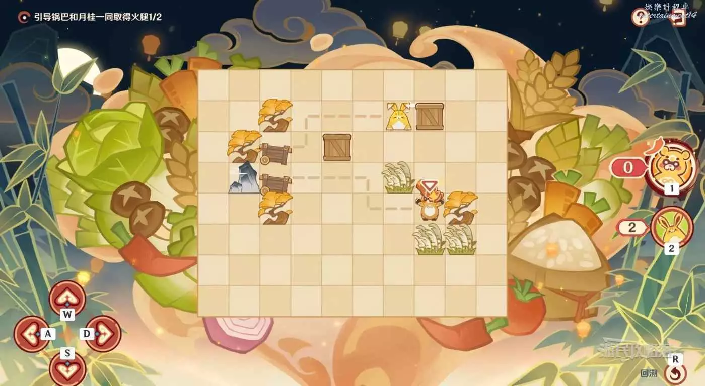 然後此時鍋巴的格子數不夠用了,返回小車一次,再移動鍋巴到箱子右側(參考下圖),繼續把箱子往左推一格,把格子數用完。