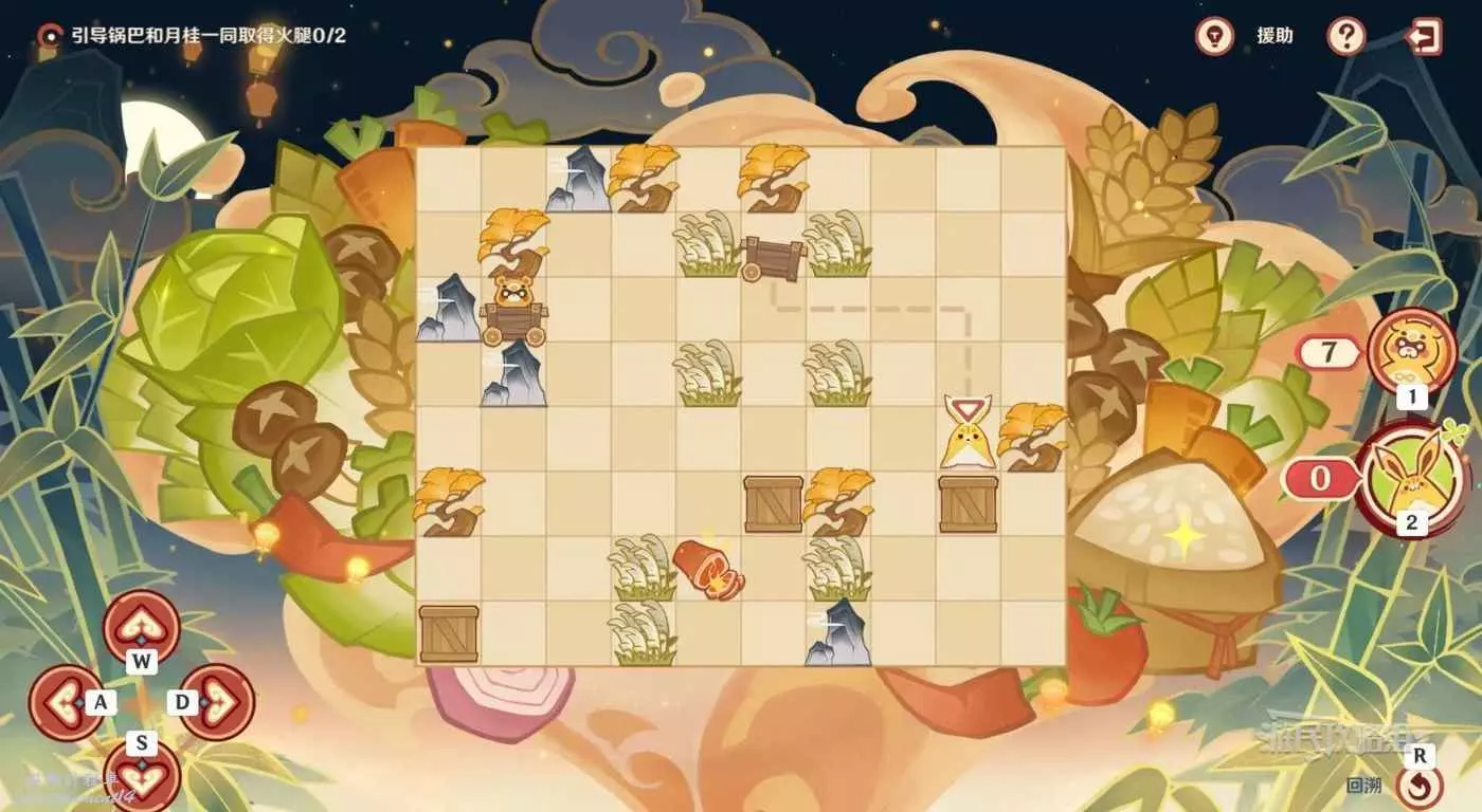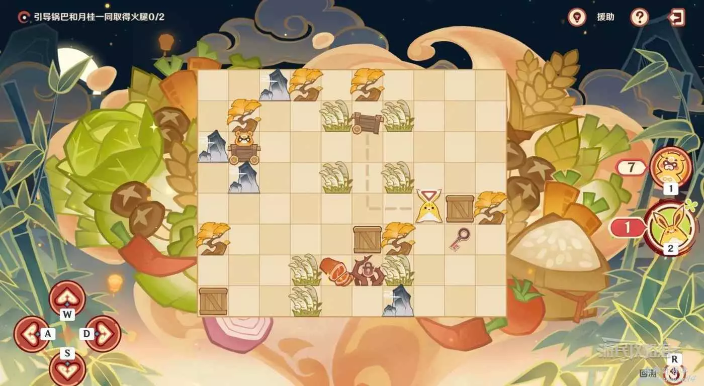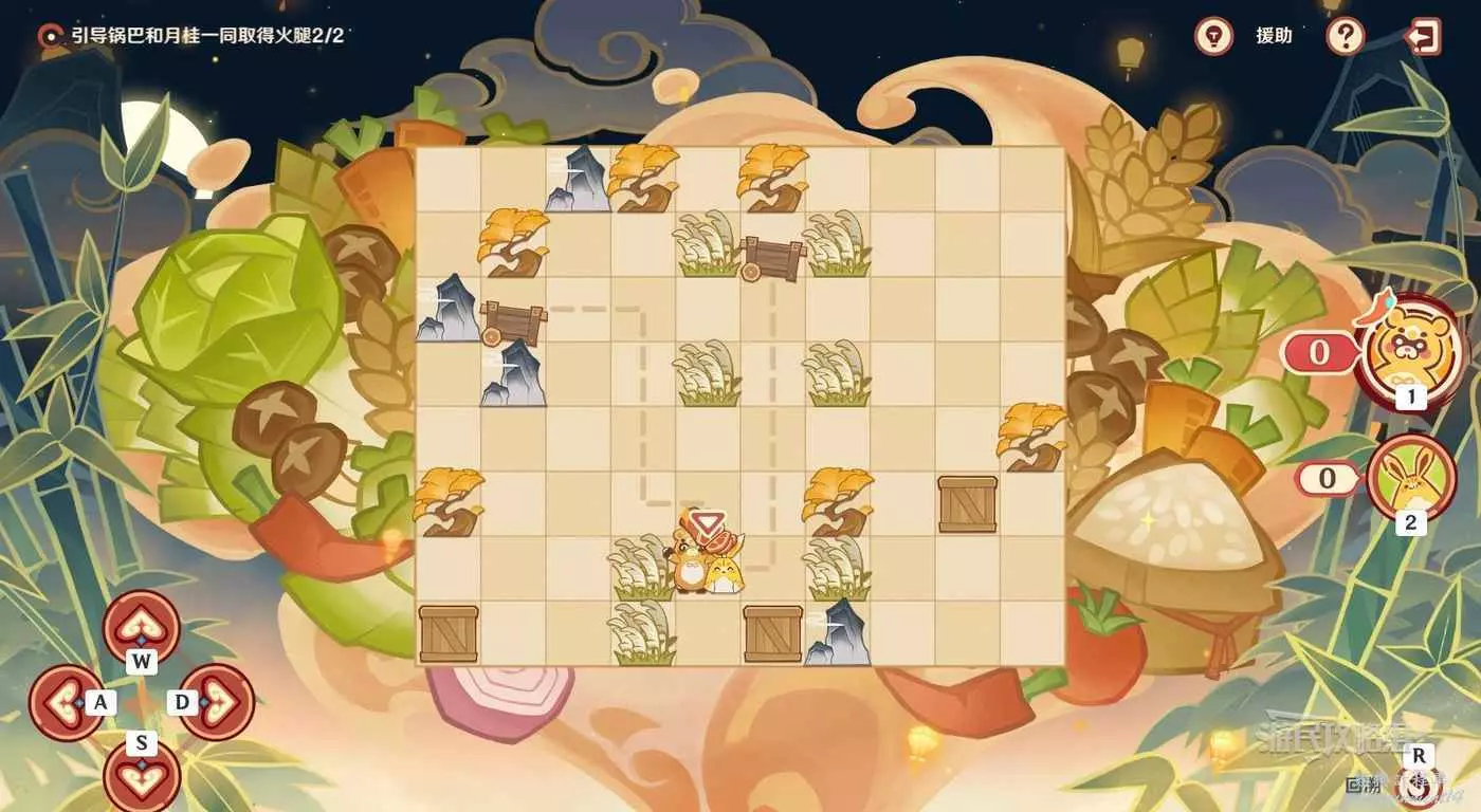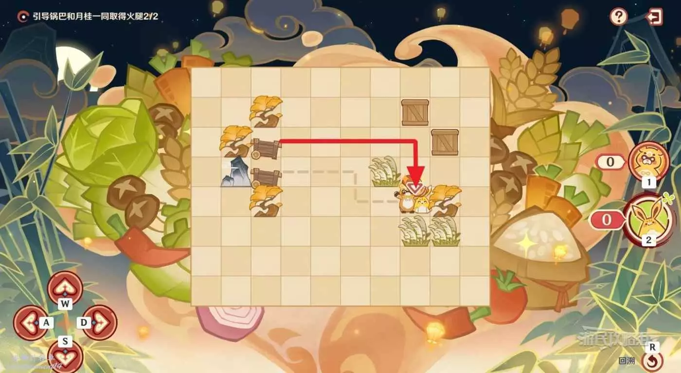 最後讓月桂返回小車位置,直著往下走,推動箱子,吃到火腿(參考下圖虛線)。