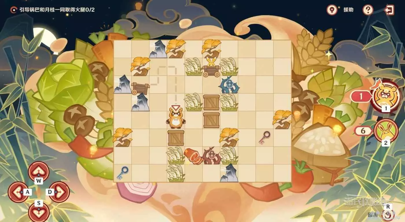 讓鍋巴返回小車,切換到月桂,按照下方虛線路線把箱子推到紅色鑰匙上方一格的位置。
