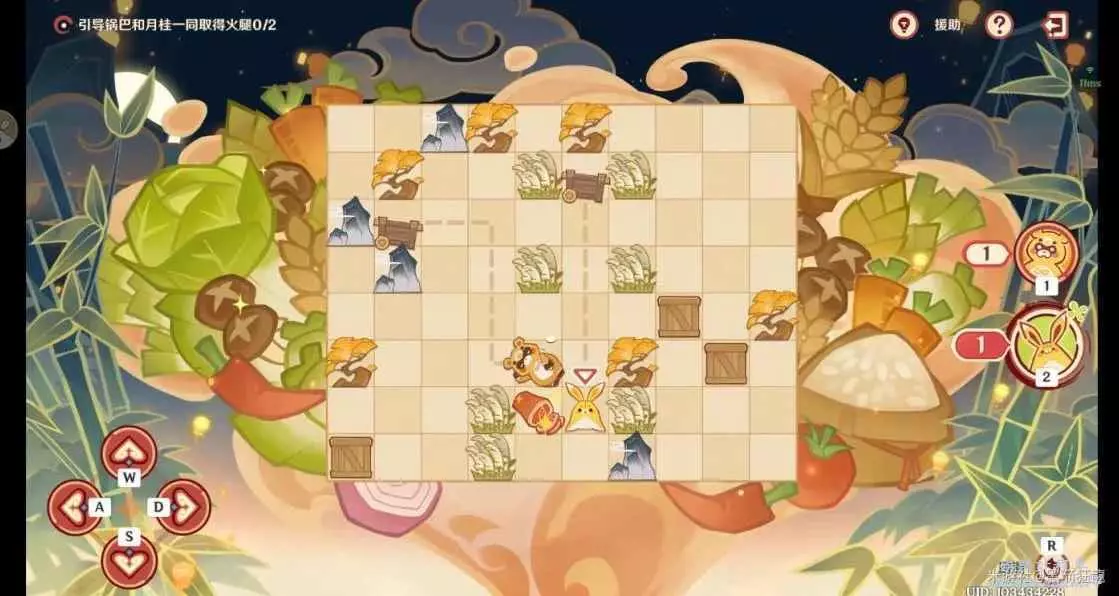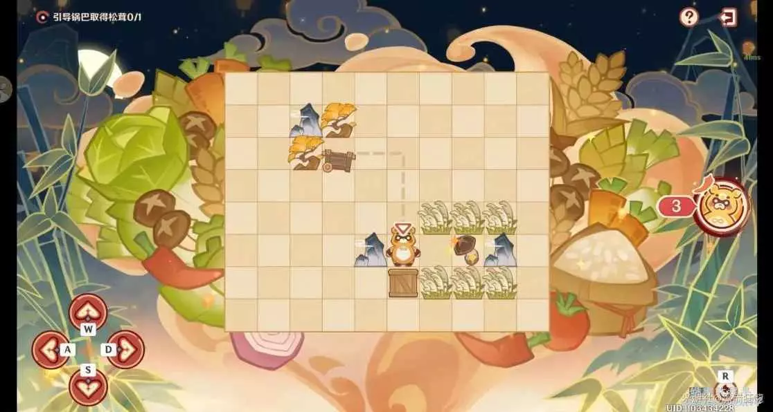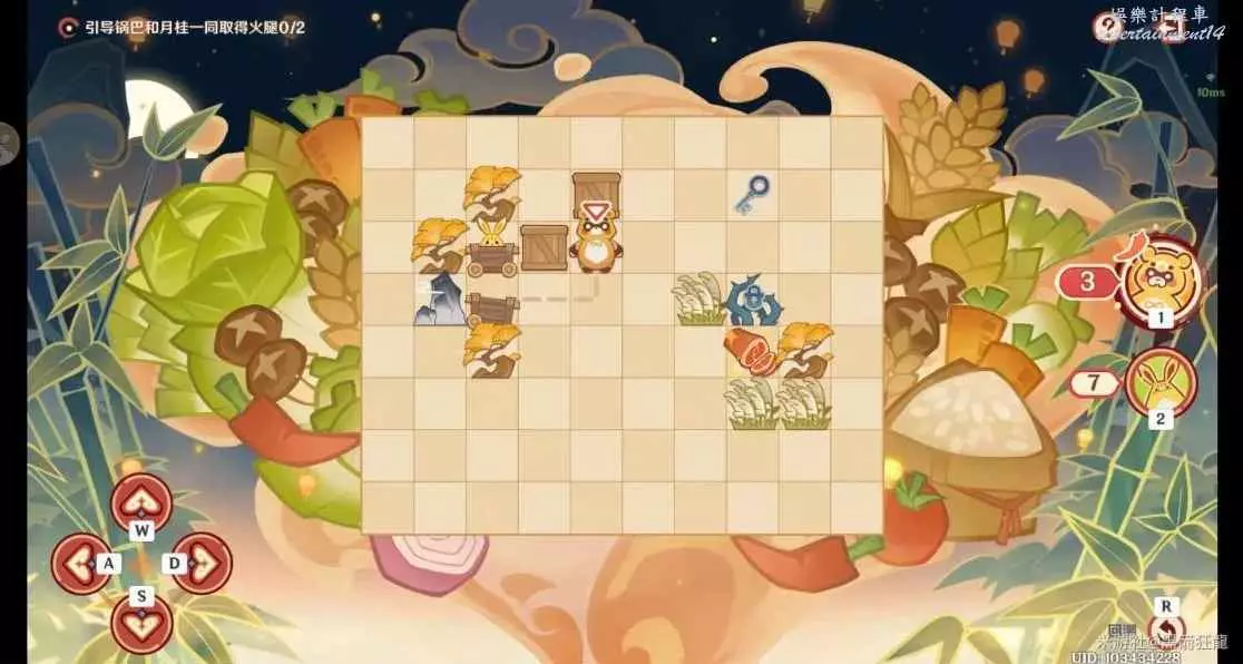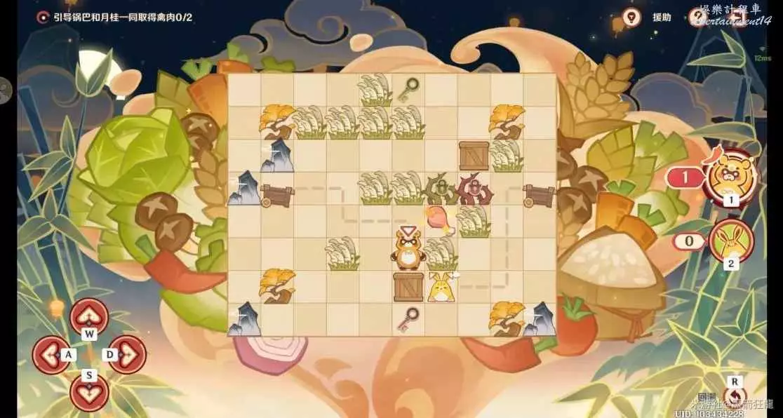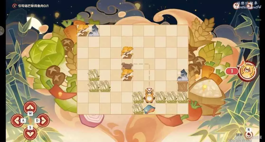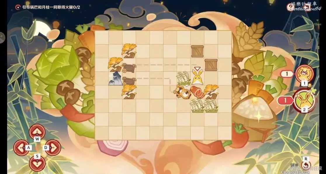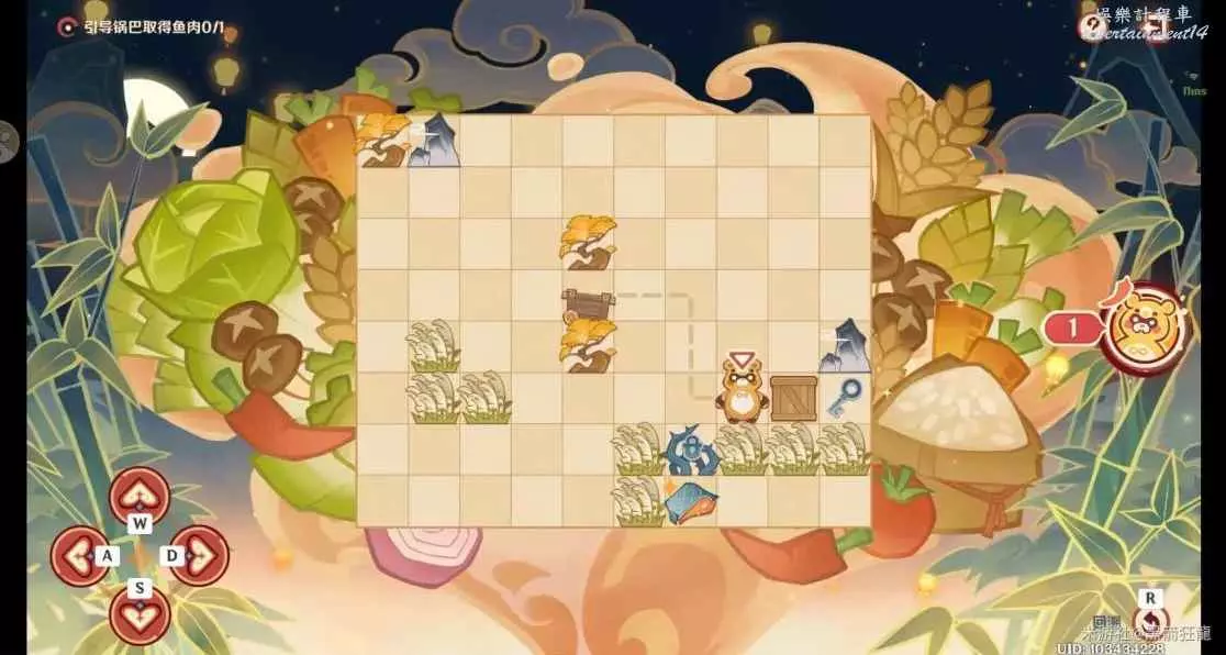③鍋巴推箱子。(中間的箱子向右推,上面的箱子向右上推)