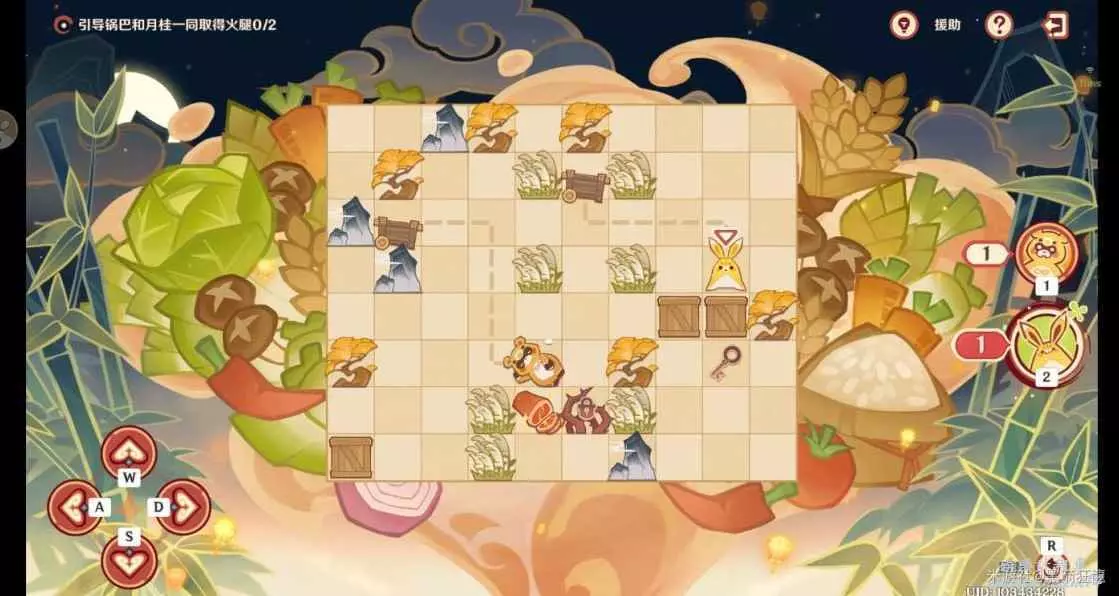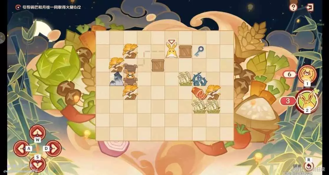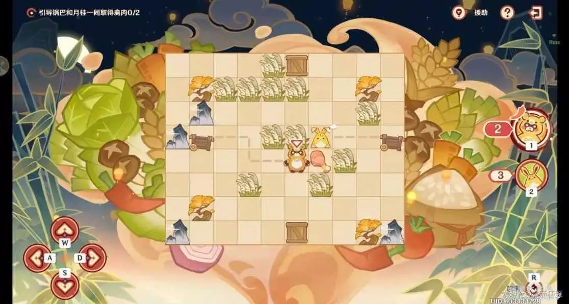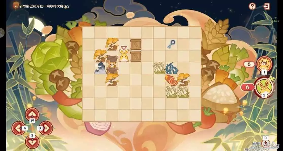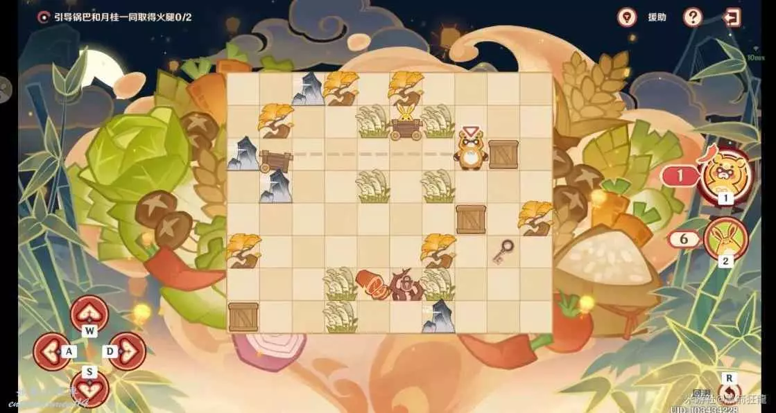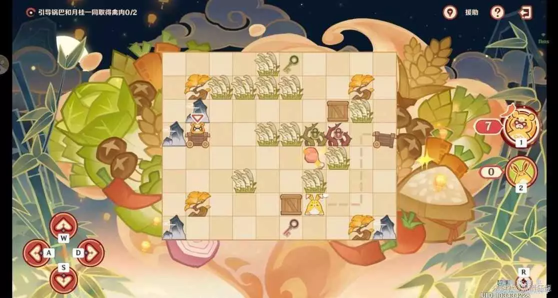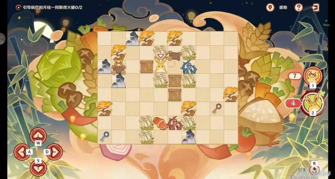 ③鍋巴推箱子。(中間的箱子向右推,上面的箱子向右上推)