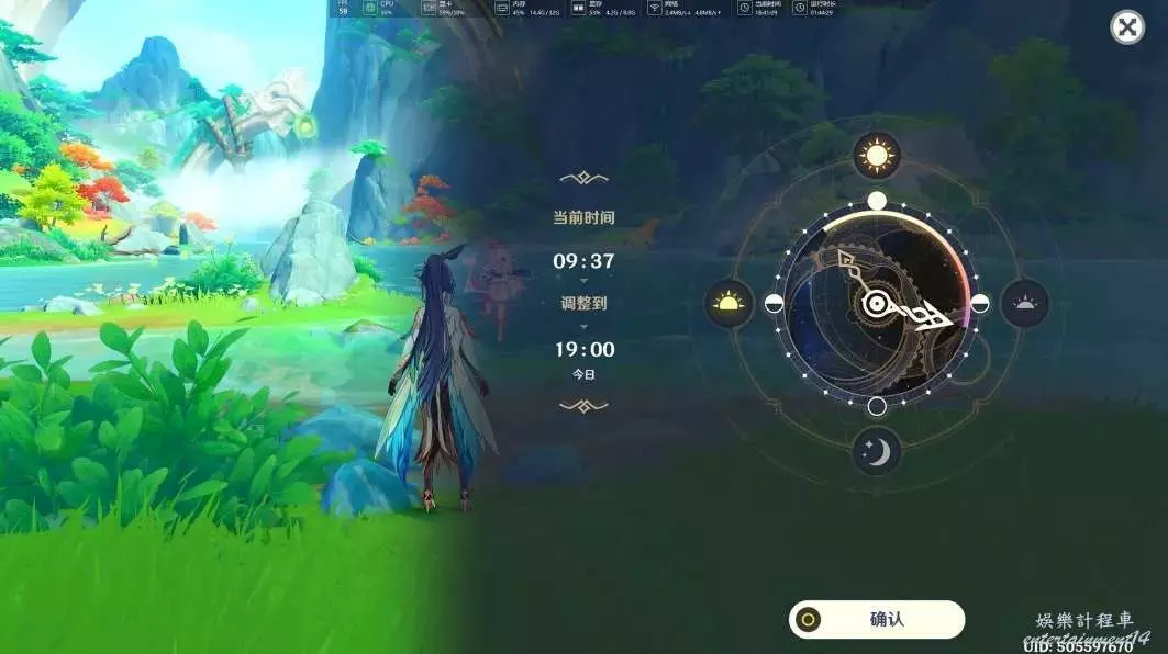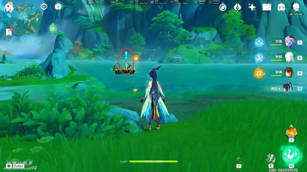將遊戲時間調整至晚上19:00~次日早上6:00之間,可以在此處看到竹筏上的小女孩,與其對話後,即可接取任務「仙人游莊」