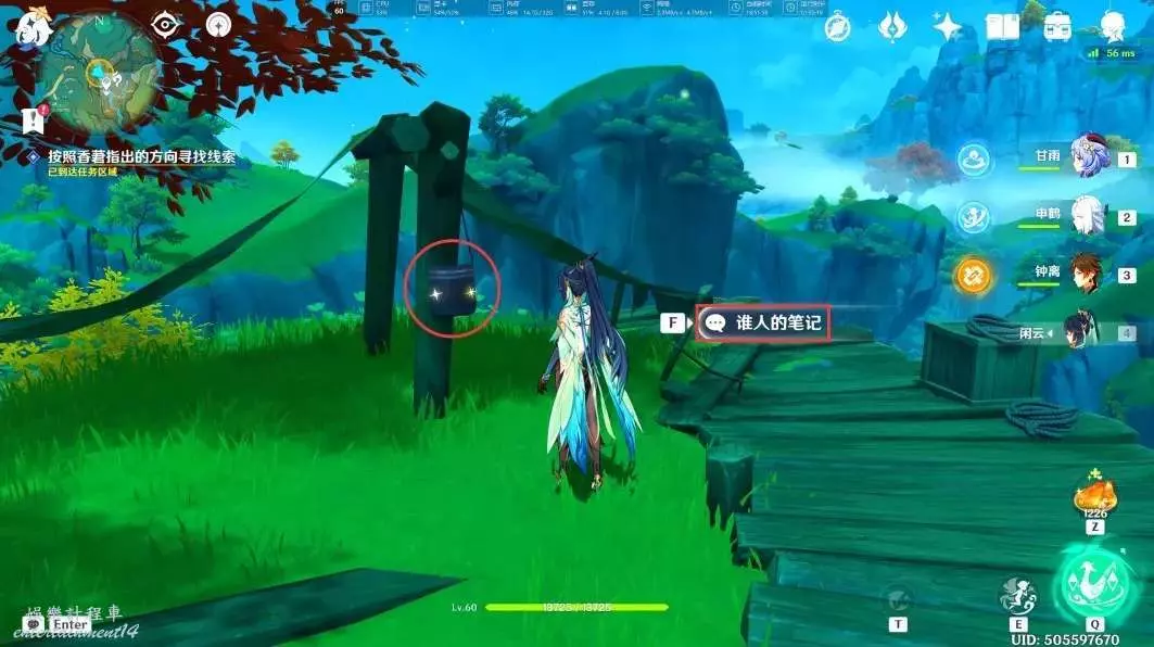在筆記中得知,香莙的爺爺已經受傷,但還是繼續前往了懸練山,我們快點追上去(可以直接傳送到懸練山的錨點過去)