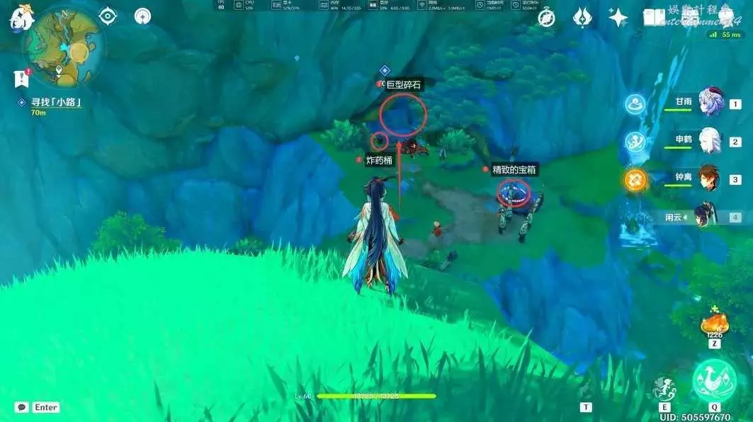 來到此處後,我們將此處的丘丘人清理掉,利用炸藥桶將山洞口的巨型碎石炸掉(此處的丘丘人一共有兩波,解決完後可以獲得一個精緻的寶箱)