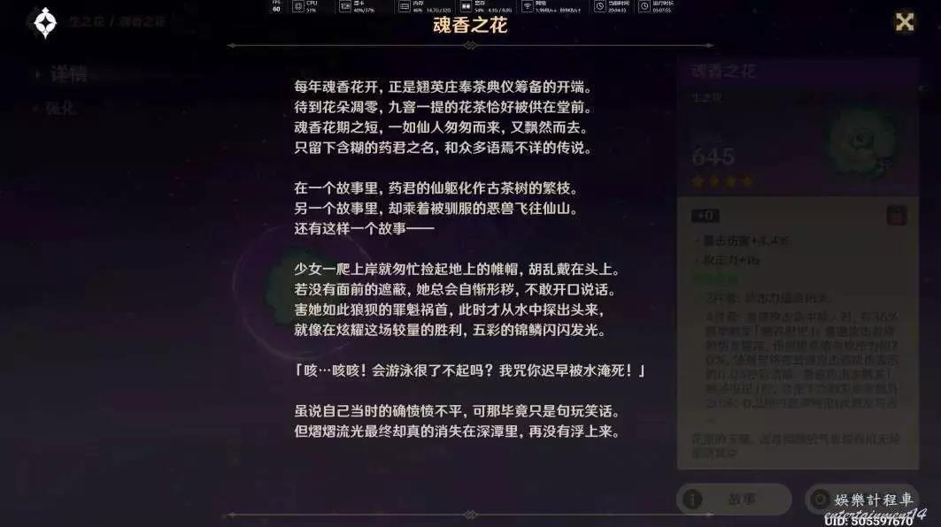 調查之後,會獲得一個四星聖遺物「魂香之花」