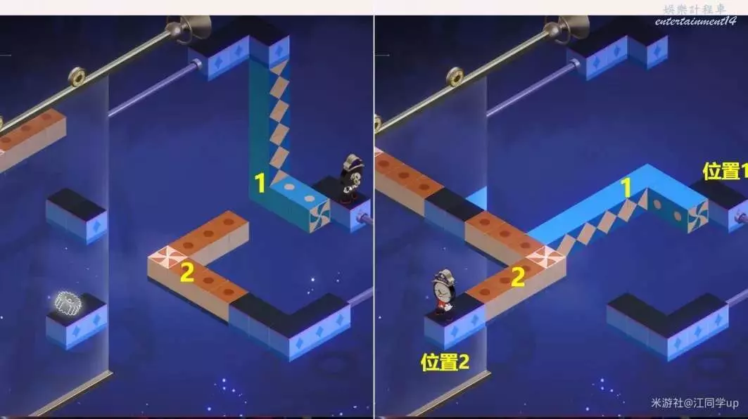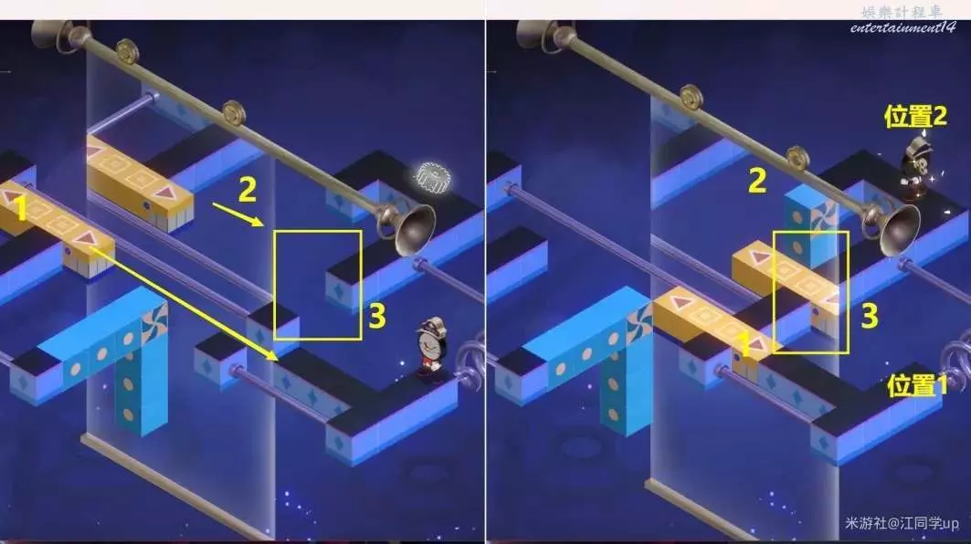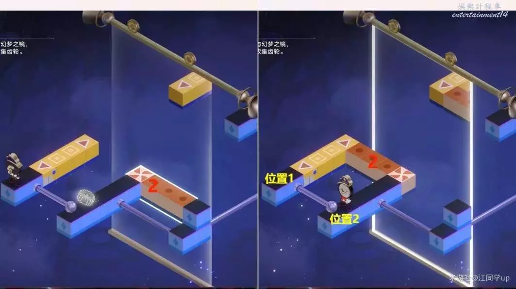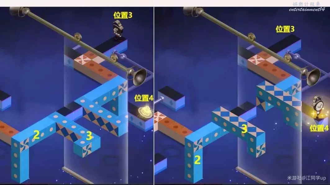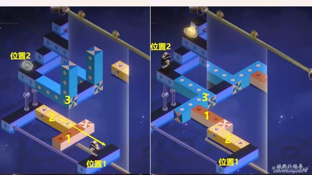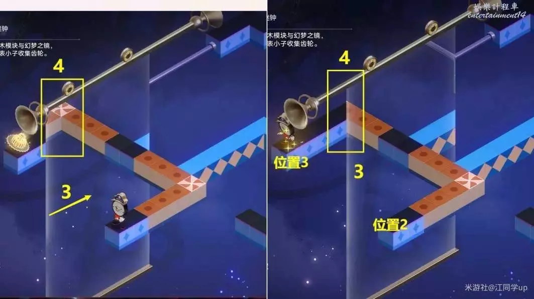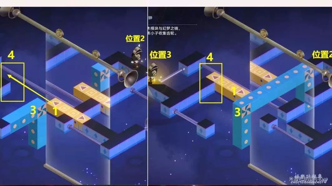 (3)將3鏡子移動到下圖位置,使4位置拼接到一塊後(形成一個直角),【鐘錶小子】會從位置2到位置3,解密完成